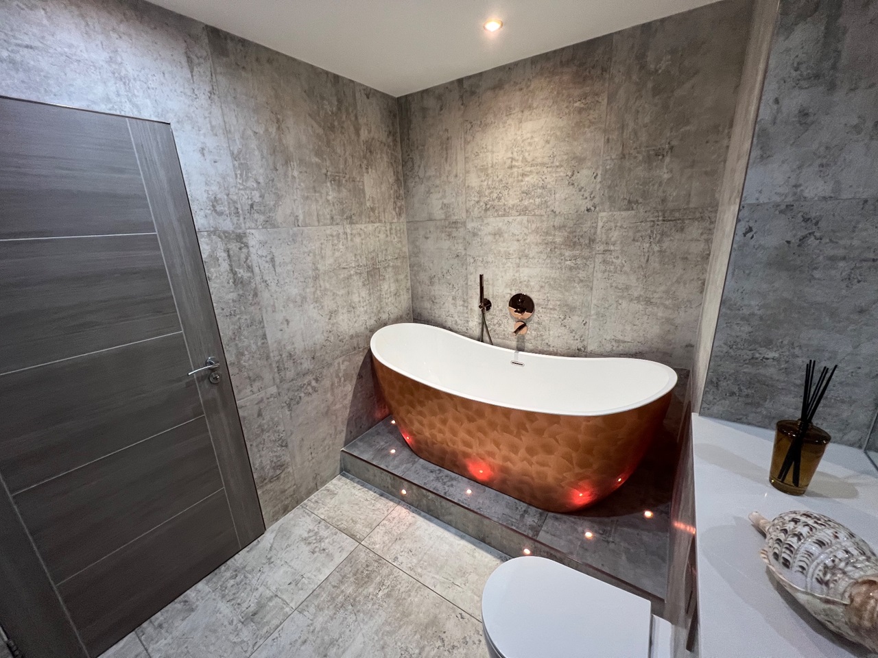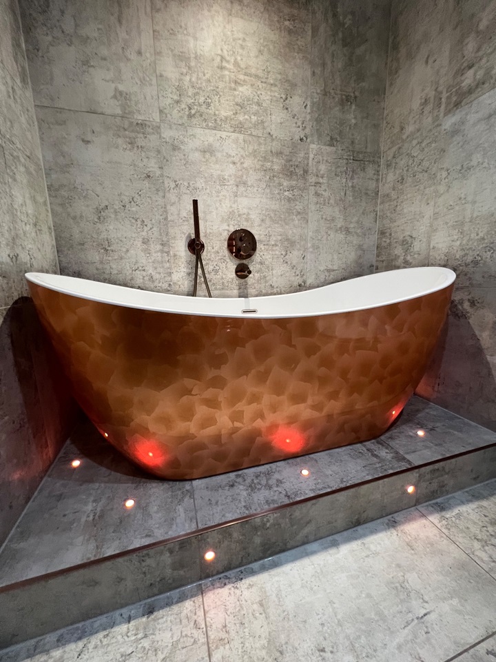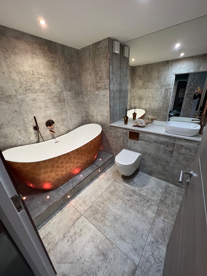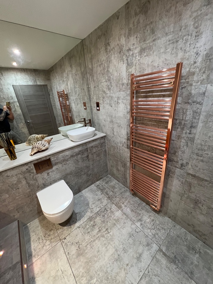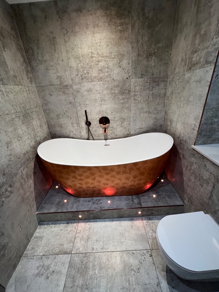 The main bathroom features a stand-out copper coloured roll top bath with the room accessorised with copper fittings including a large copper towel radiator.