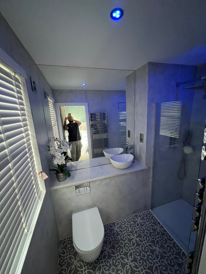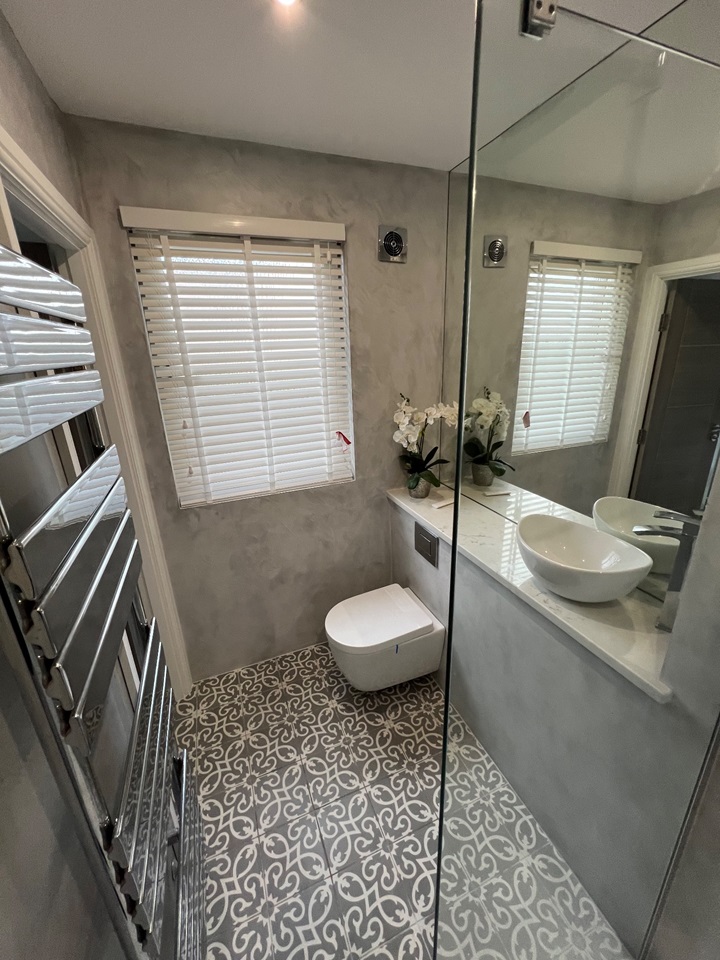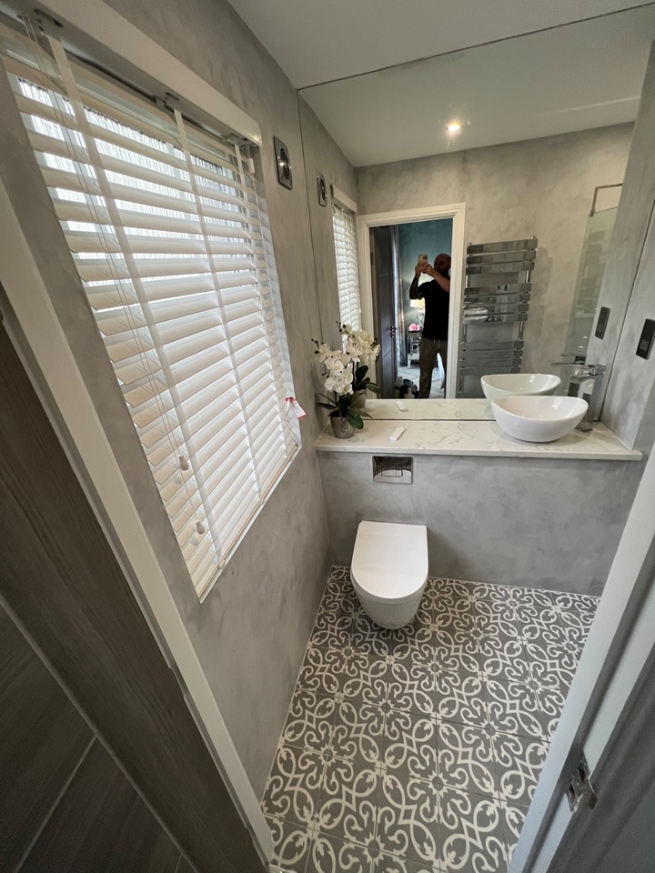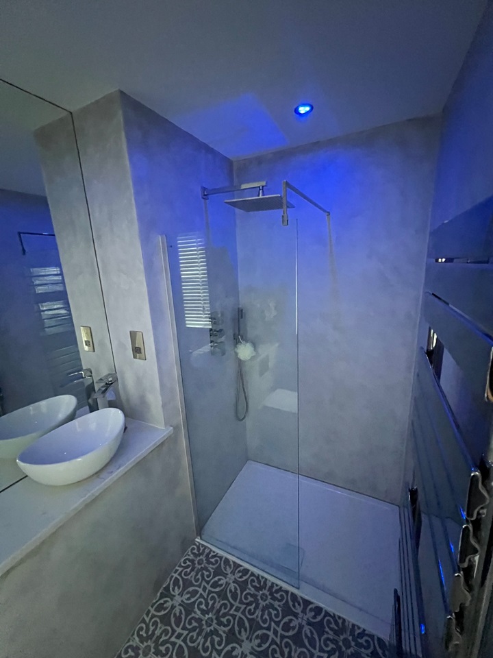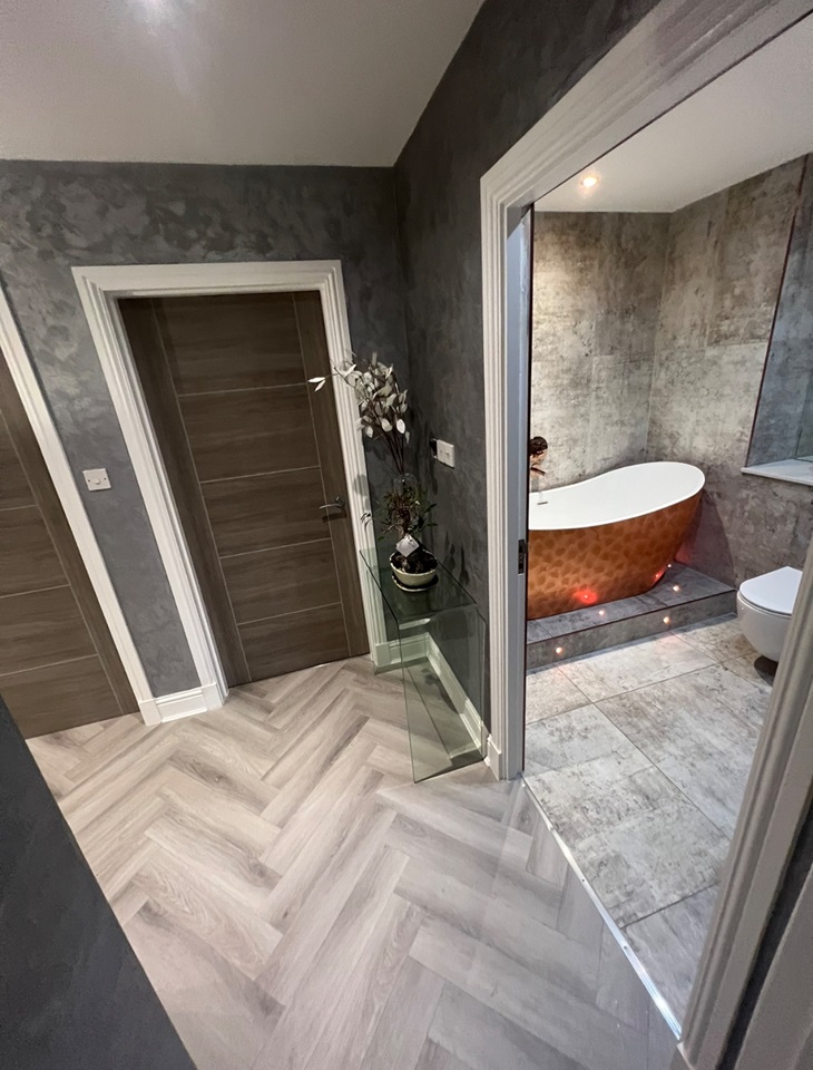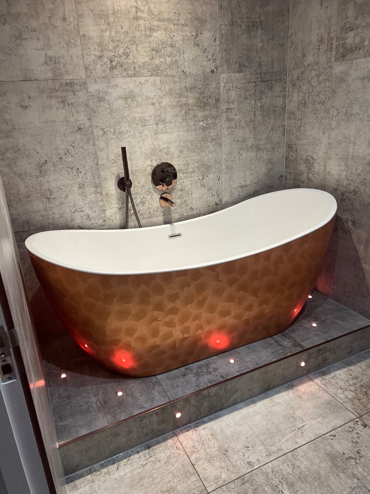 The main bathroom features a stand-out copper coloured roll top bath with the room accessorised with copper fittings including a large copper towel radiator.
