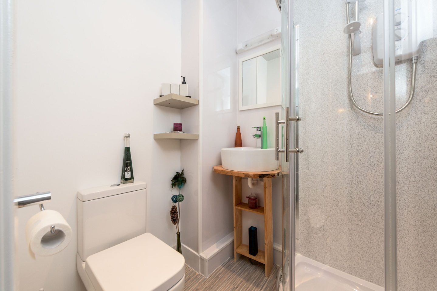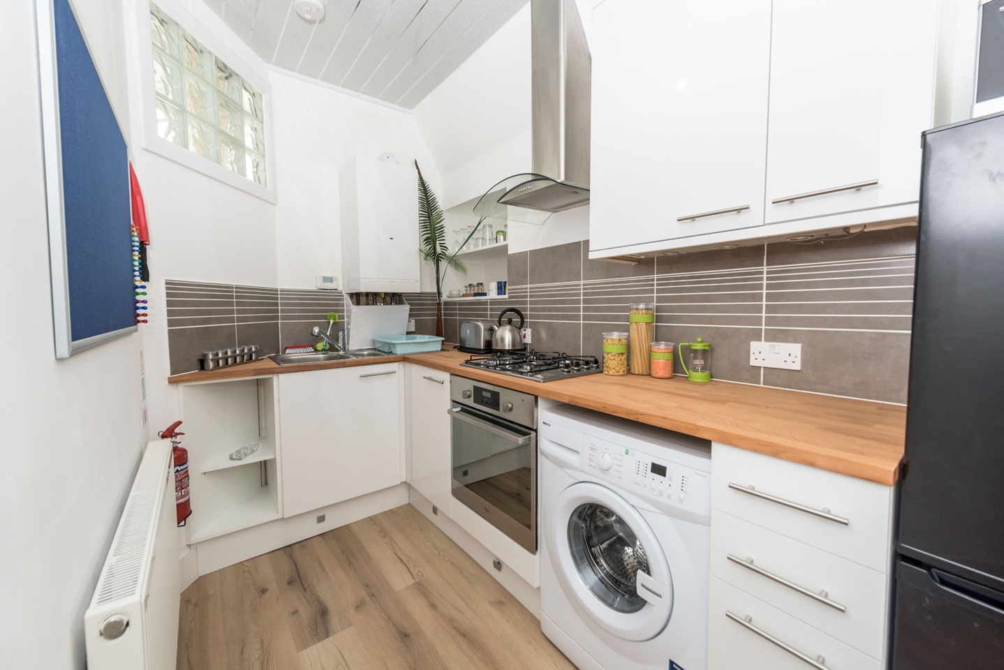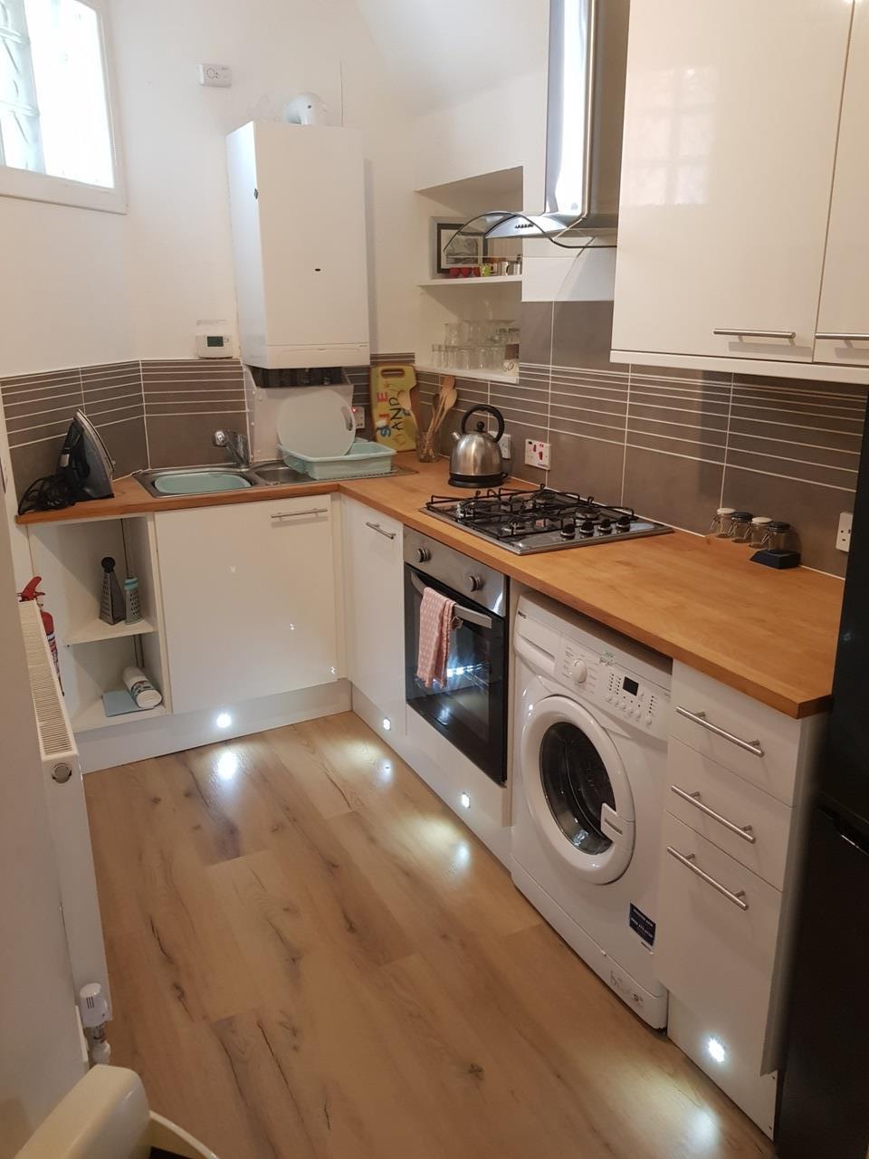 MODERN KITCHEN AND BATHROOM. WOOD LAMINATE FLOORING THROUGHOUT.