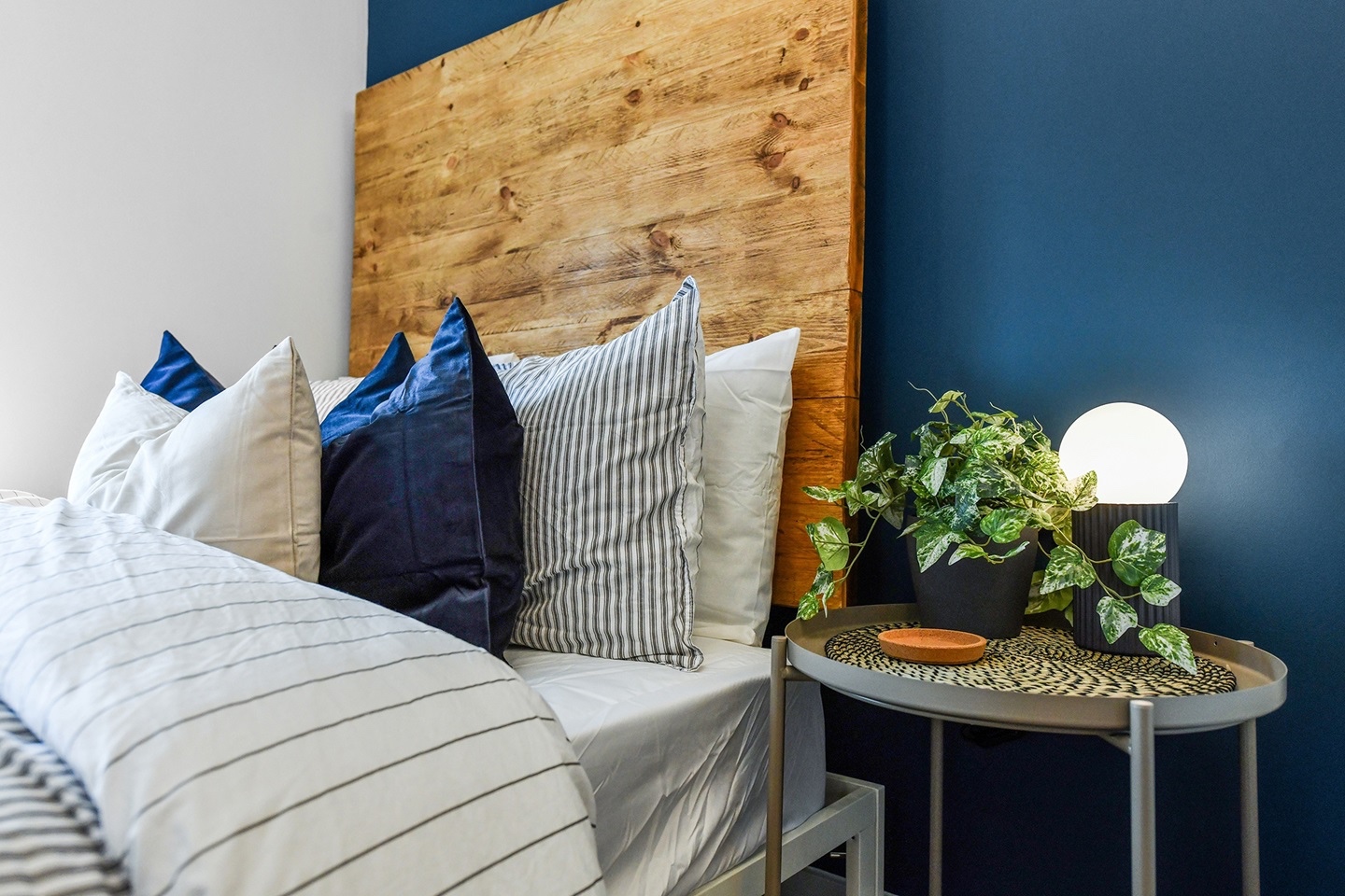 - Bedside tables with storage and bedside reading lamps