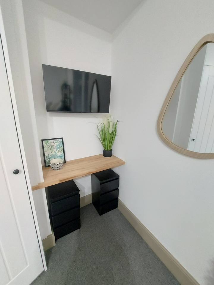 BEDROOM comes with a seating area, 32” Smart TV., pocket sprung mattress, underbed storage, table and chair, mirror, bedside table and lamp and wardrobe.