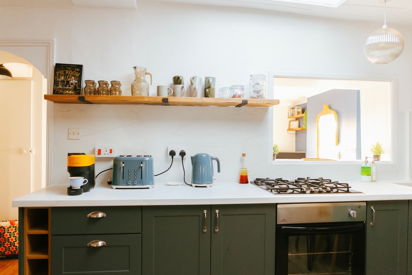 There is a gas hob, oven, fridge freezer, kettle, toaster, Nespresso coffee machine, microwave & washing machine.