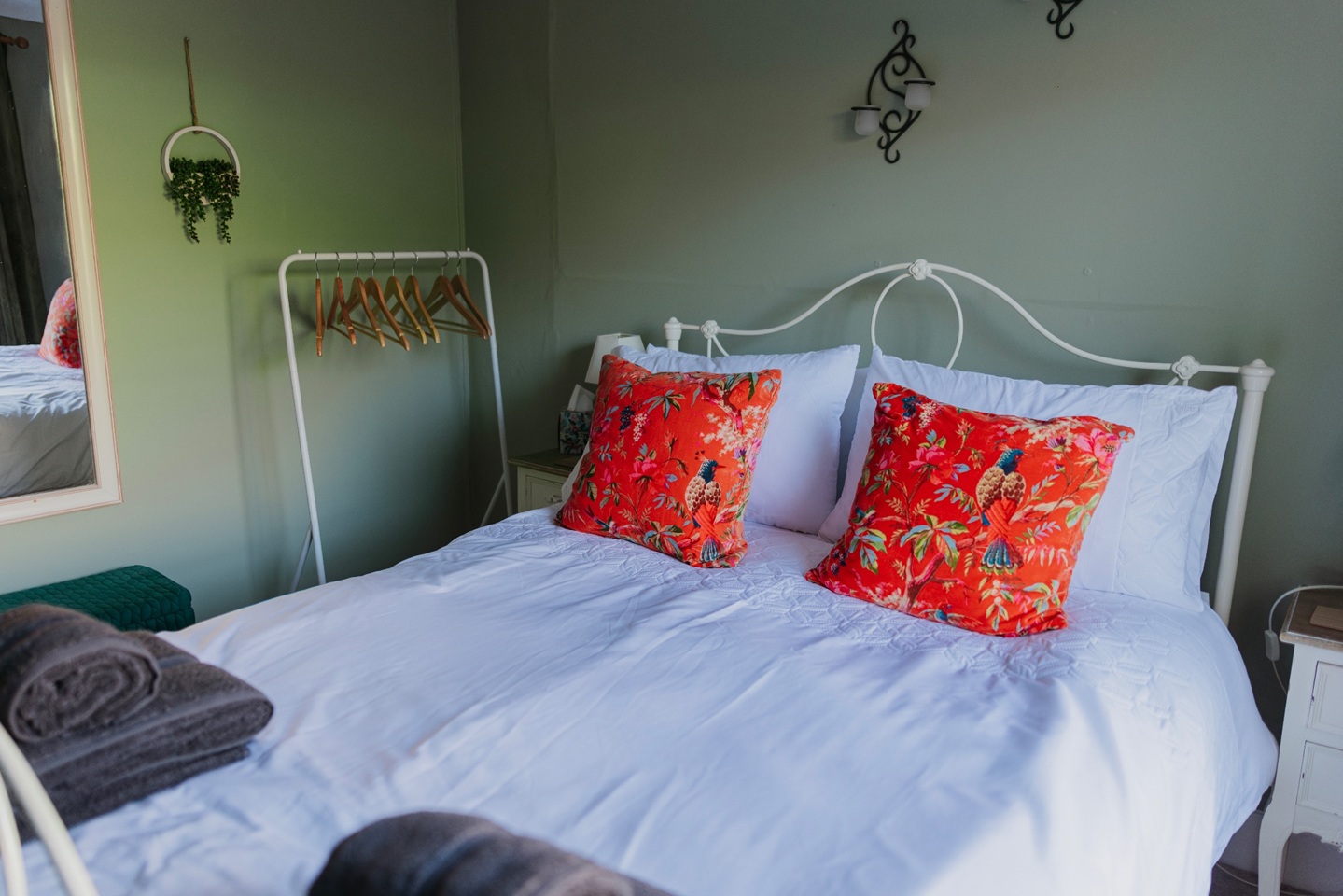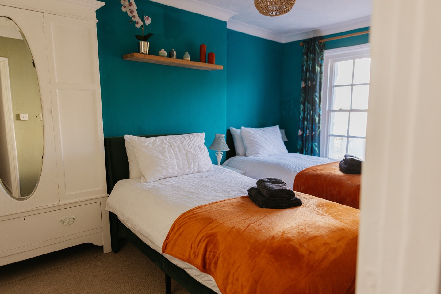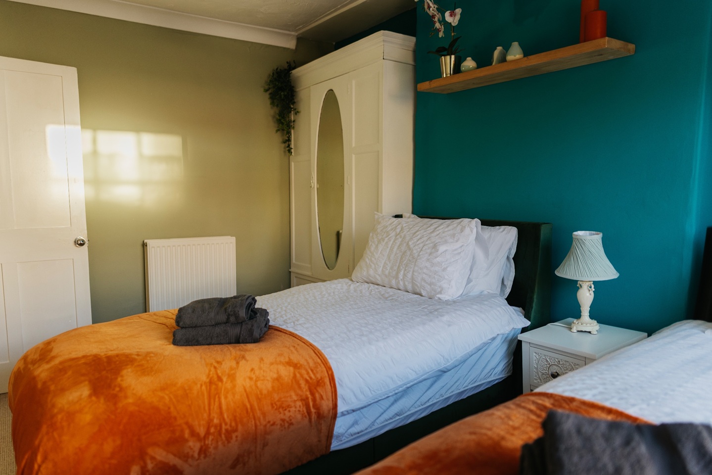 Bedroom 2: 2 x single beds, bedside units and hanging rail.