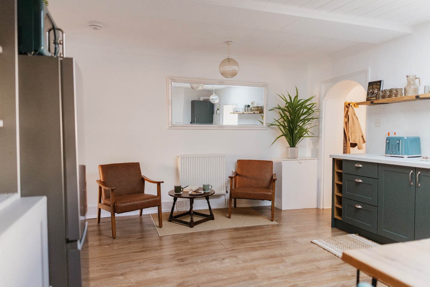At the end of the kitchen/dining area, there are two easy chairs and a coffee table, providing additional seating in what is ‘the hub’ of this apartment.