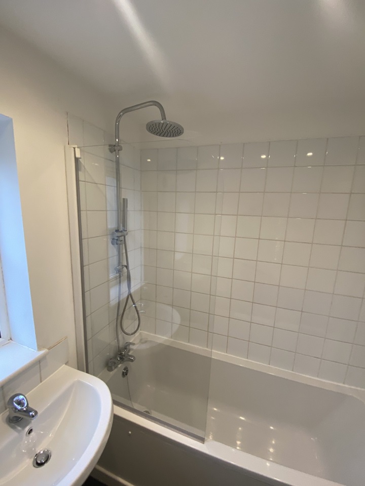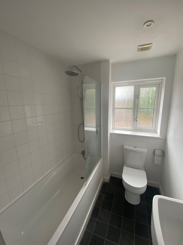 The front door leads into a light and airy hallway with porcelain tiled floor, The tiled floor continues into the modern shaker style Howdens kitchen with glass extractor fan with space for a washing machine and full height fridge/freezer. There is a gas hob with an electric oven.