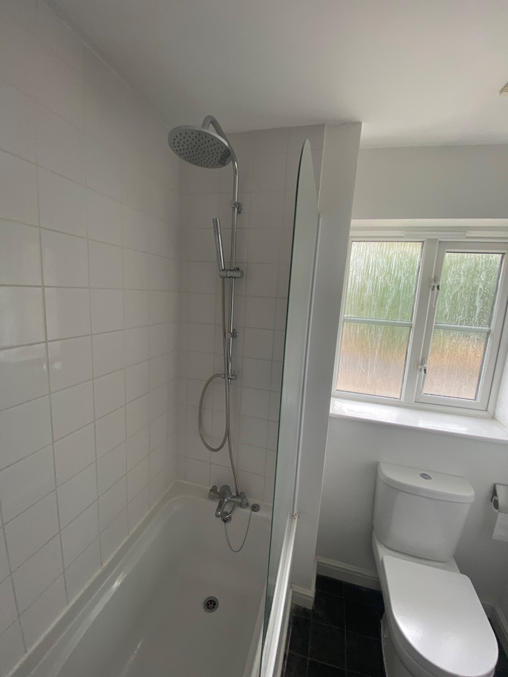 - 1 bathroom with modern white suite and bath featuring an attractive rainfall shower head