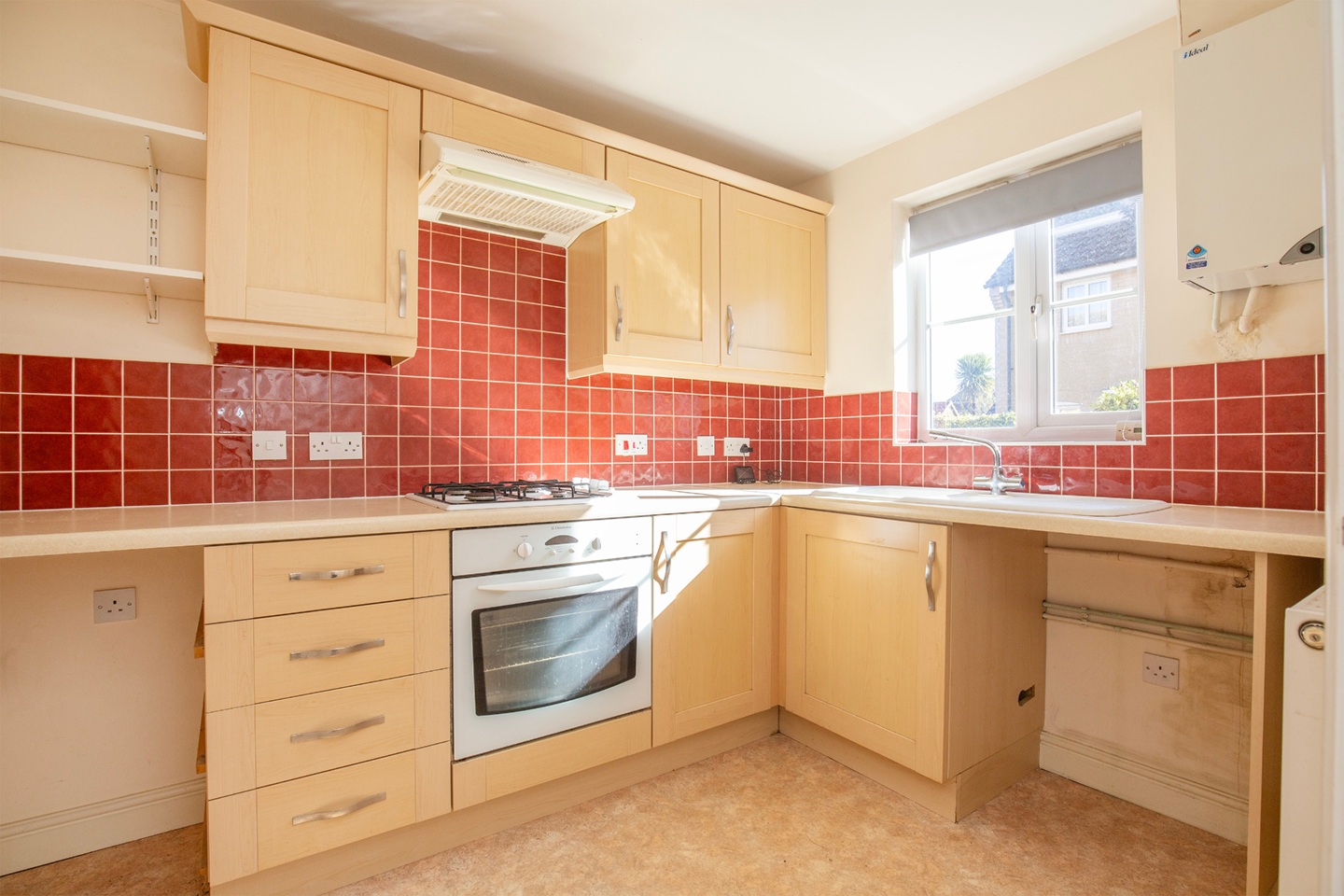 The modern south facing kitchen has shaker style cupboards, a gas hob and electric oven plus space for washing machine and fridge.