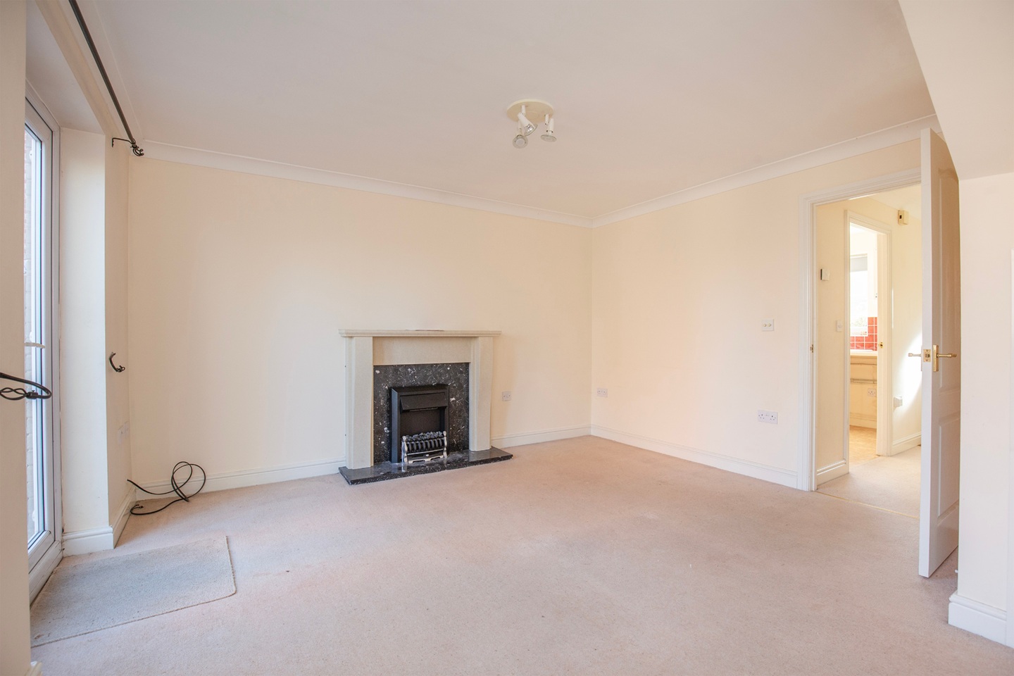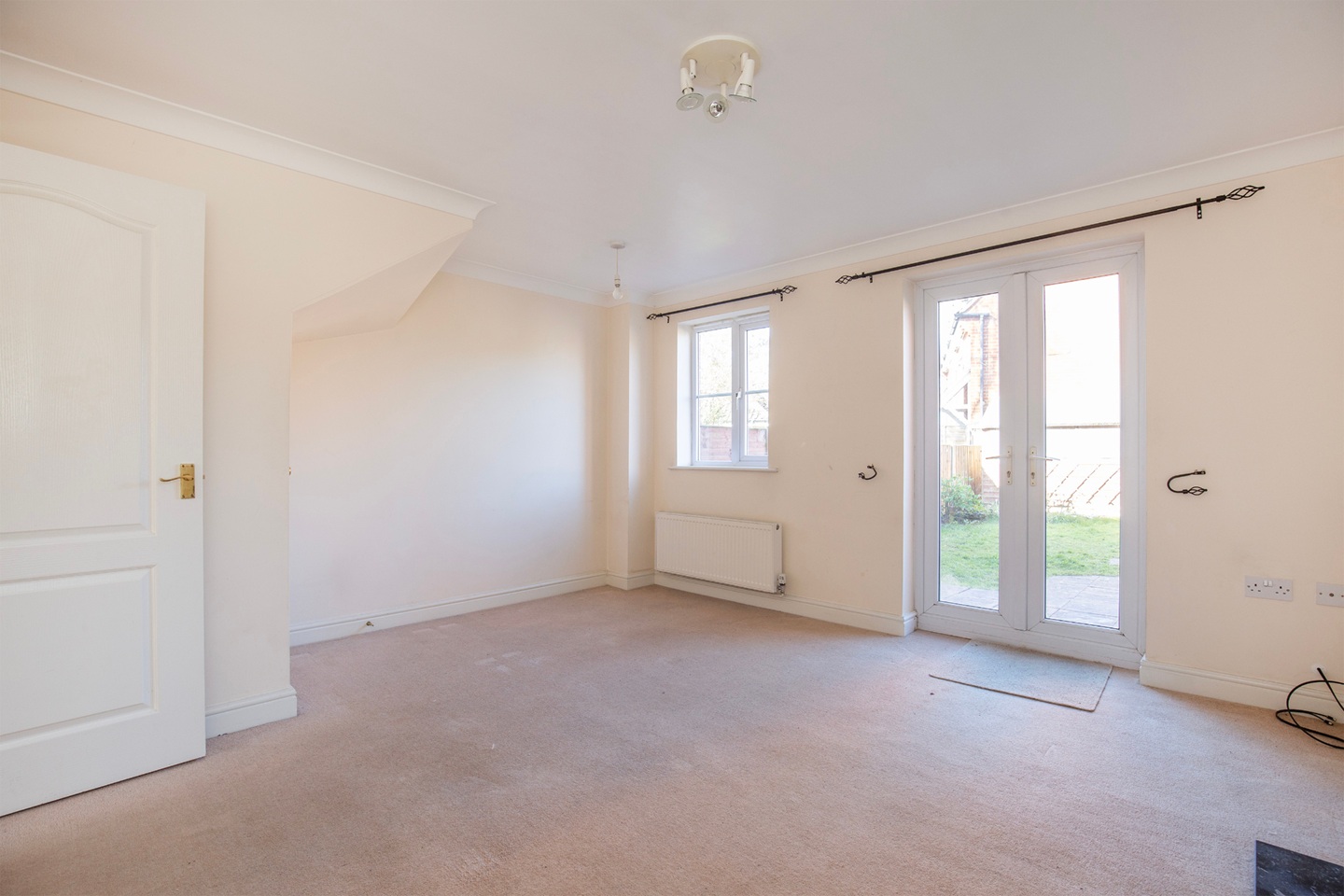 The hall leads to the living room (13'9" x 13'4")with electric coal effect fire, under stairs storage cupboard and french windows to the garden.