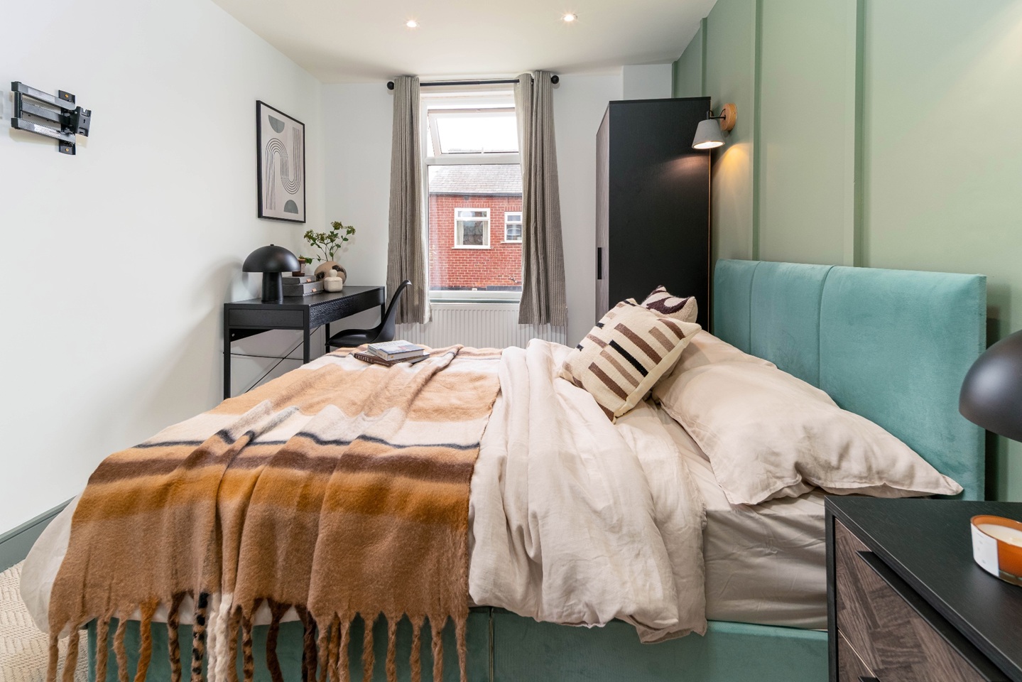 A stylish and comfortable ensuite double room, furnished with a double bed, wardrobe, desk, and bedside table - offering a great space to relax!