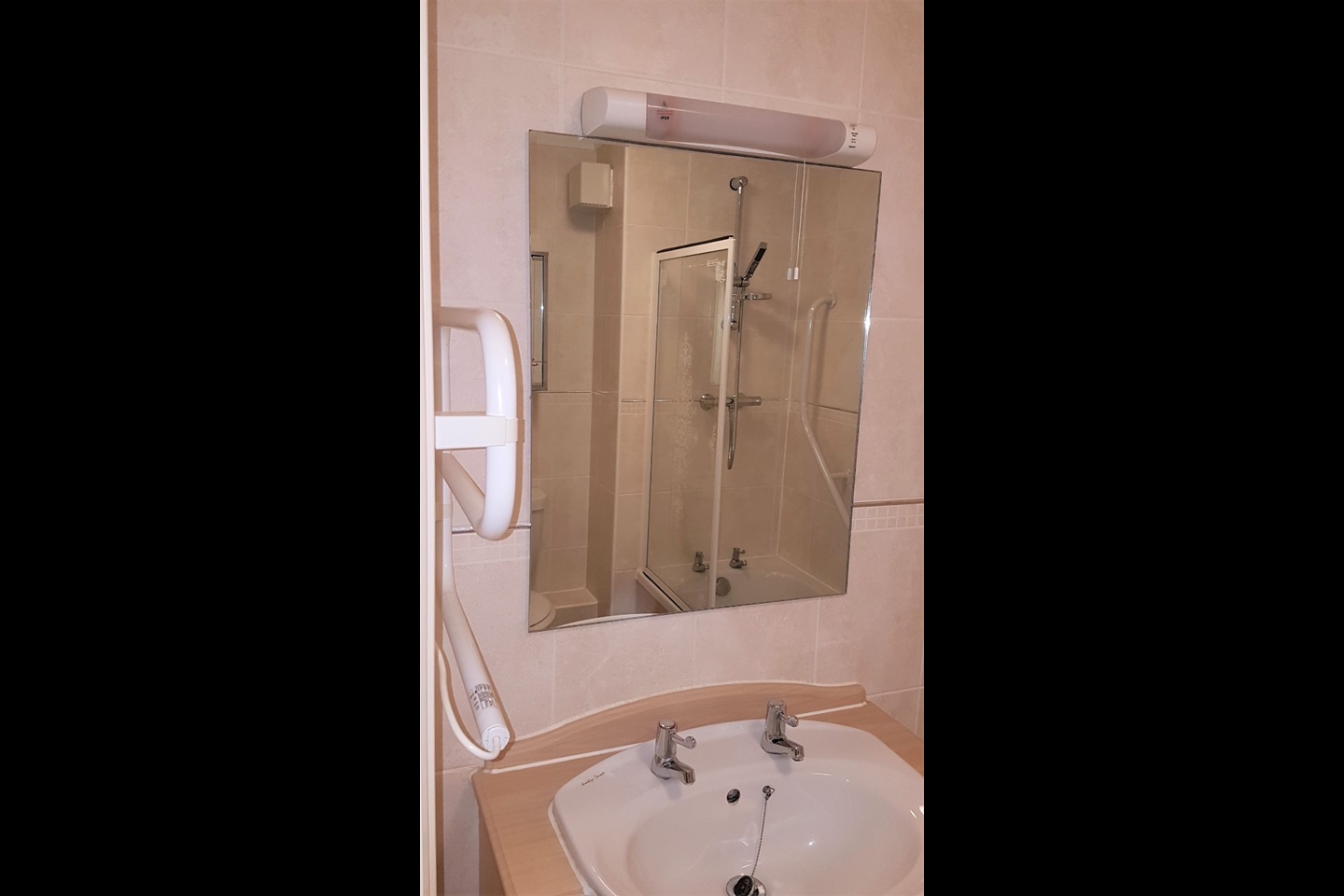 Bathroom - 6'6" x 5'7"(2m x 1.7m) -includes white suite comprising sink, WC, low profile bath with shower. It also has a heated towel rail and emergency pull cord to connect to the personal safety monitoring service.