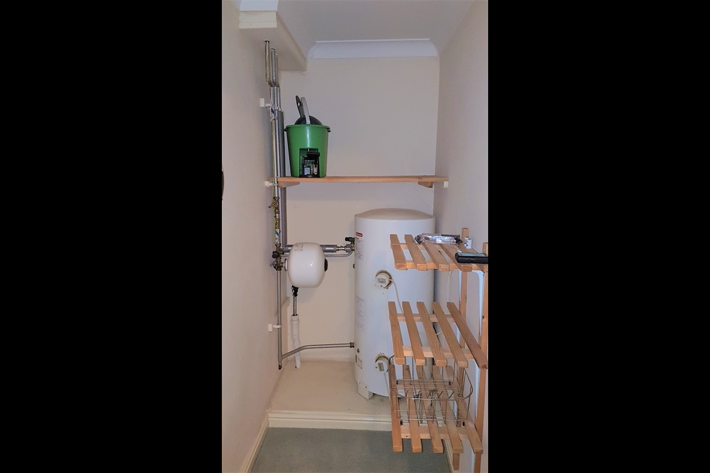 Storage - 6'6" x 3'3" (2m x 1m) walk in storage, airing shelves, hot water tank with dual immersion heaters.