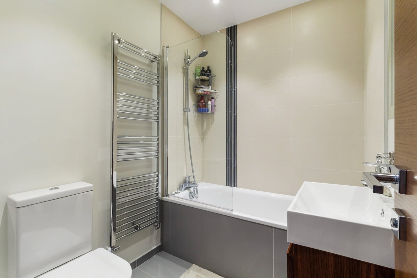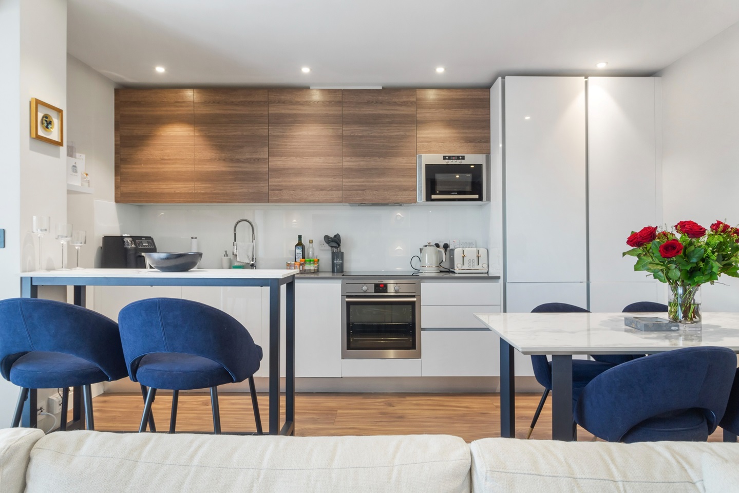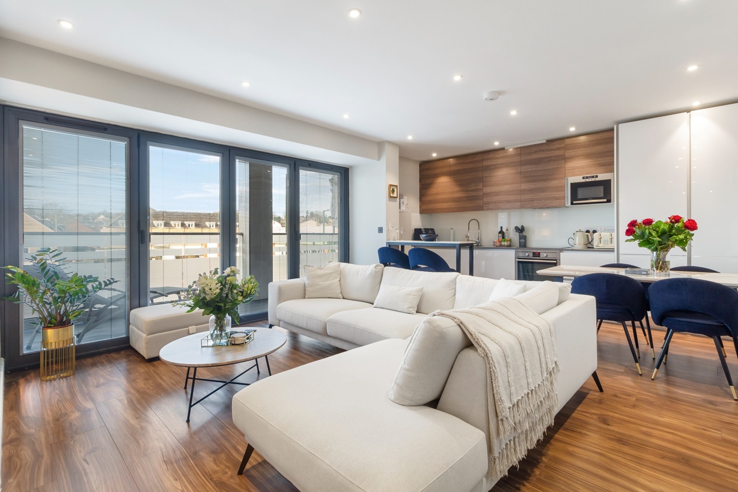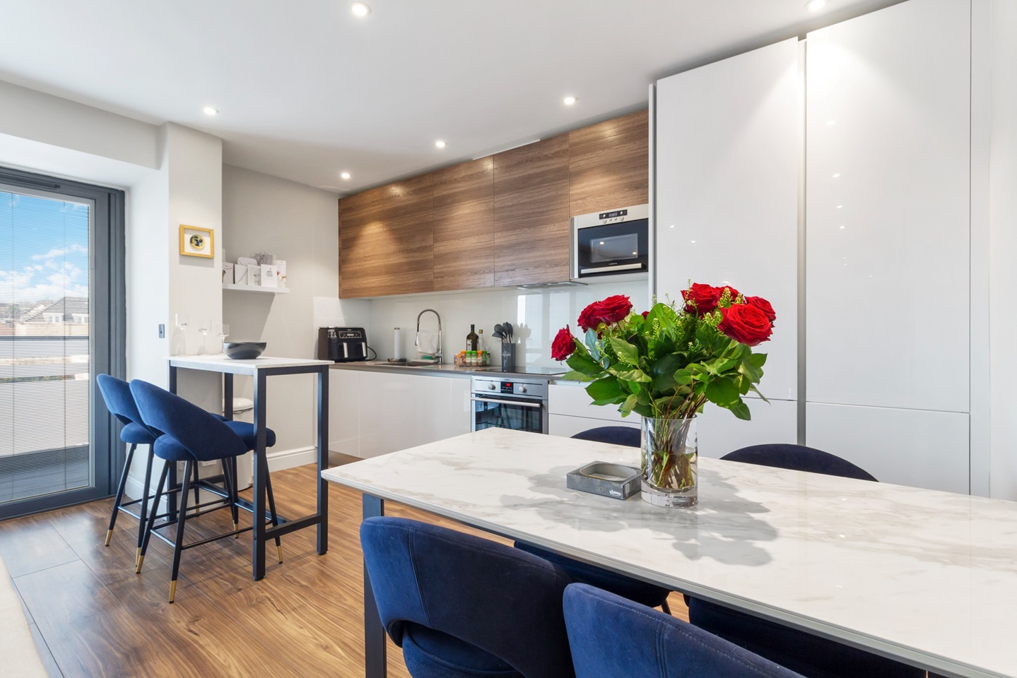 The living room comprises of a brand new bespoke cinema/media wall with fireplace & walnut flooring complementing grey metallic bi-fold doors leading to a balcony with scenic views. Italian white gloss and walnut fitted kitchen with grey granite worktops complement the integrated AEG appliances (single oven, hob, extractor hood, microwave oven, dishwasher).Freestanding washing machine is also included.
