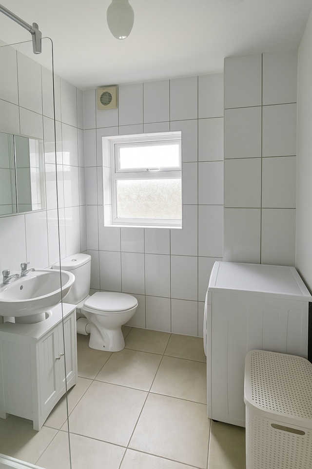 • Fully tiled bathroom with shower enclosure, WC and basin