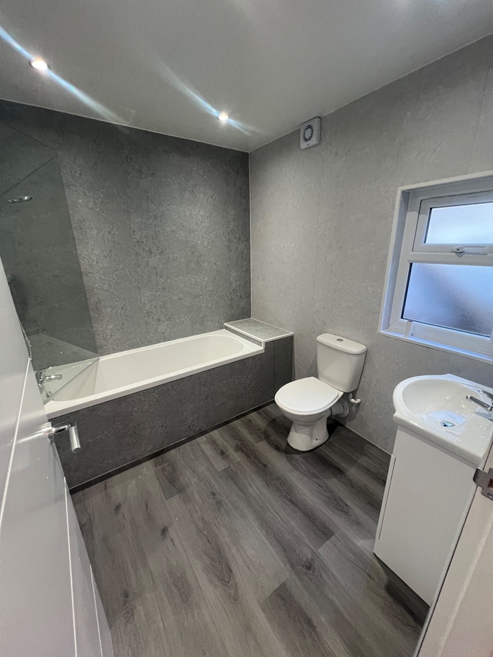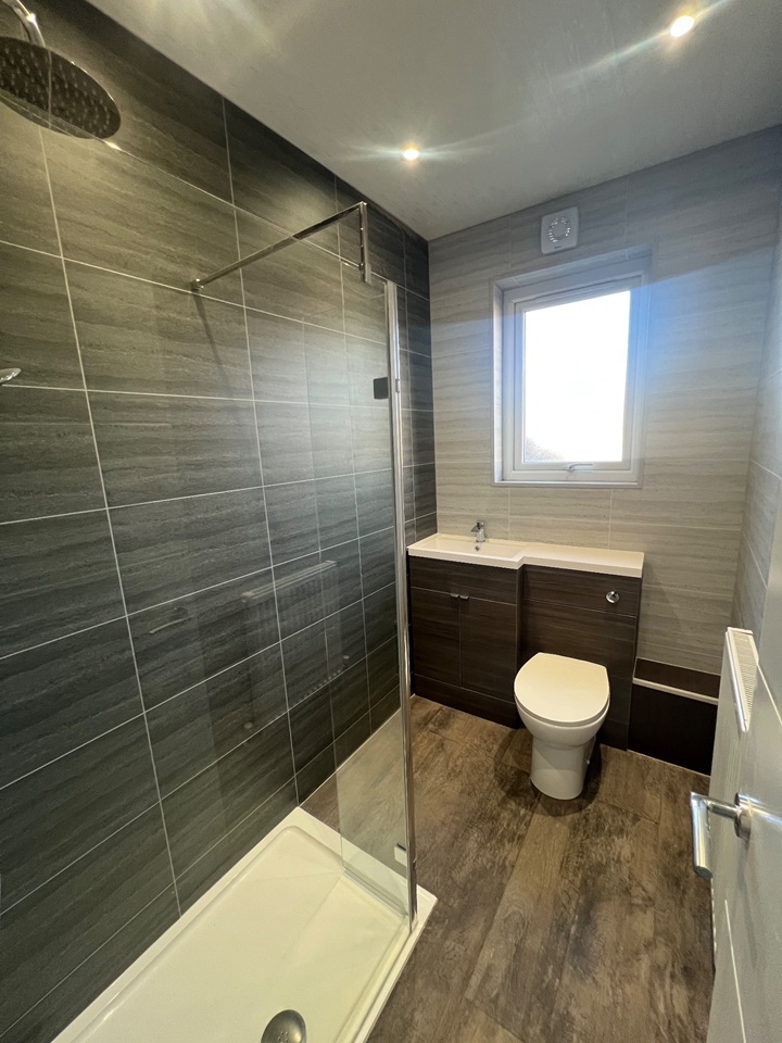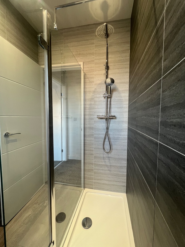 · Handy second bathroom on the 1st floor with walk in shower. Finished with sleek grey tile effect cladding.