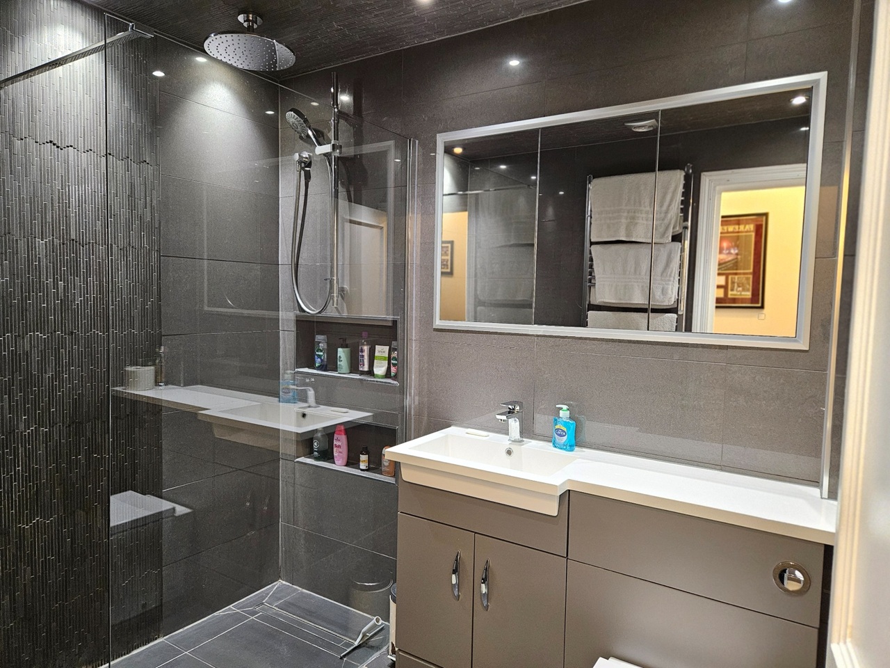 Hotel-style walk-in rainfall shower, plush towels, shampoo & body wash provided.