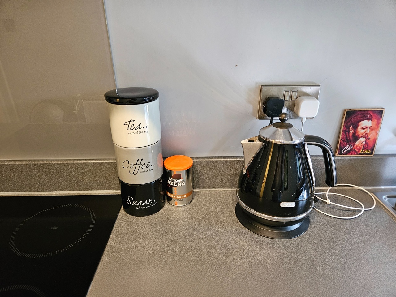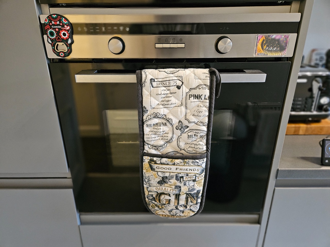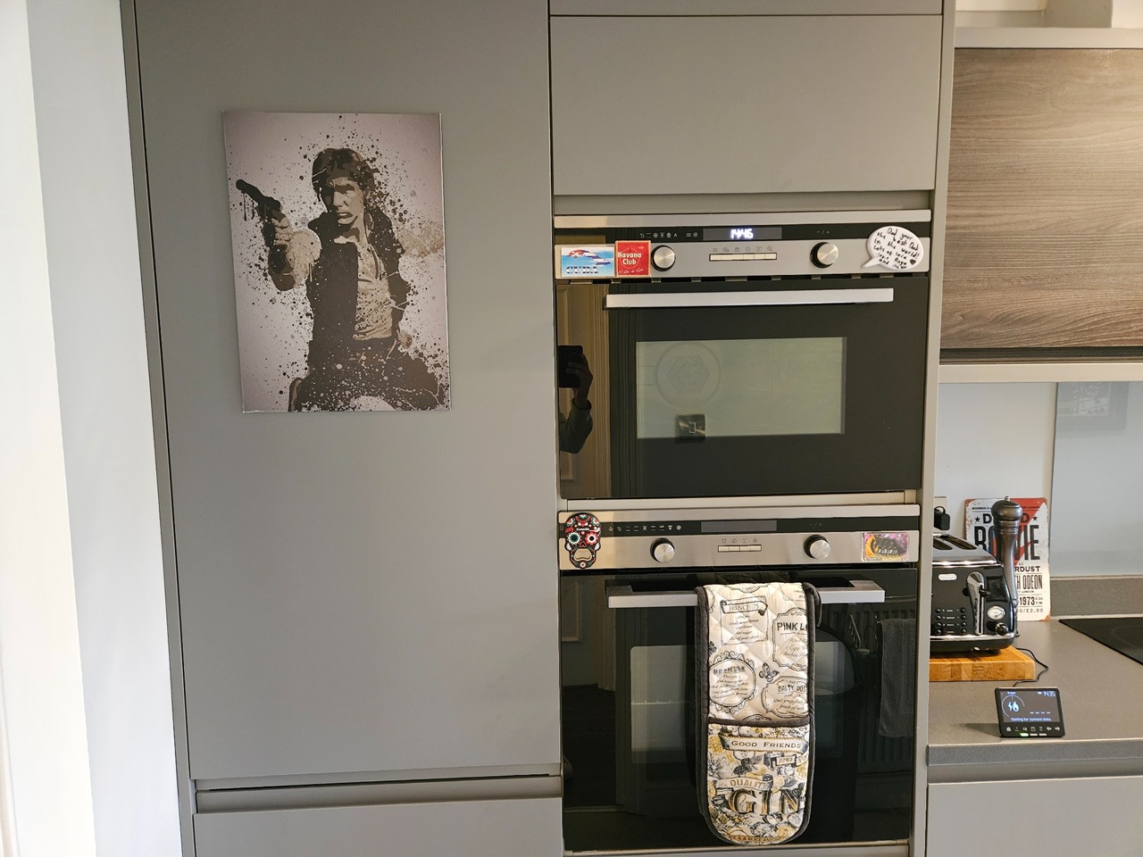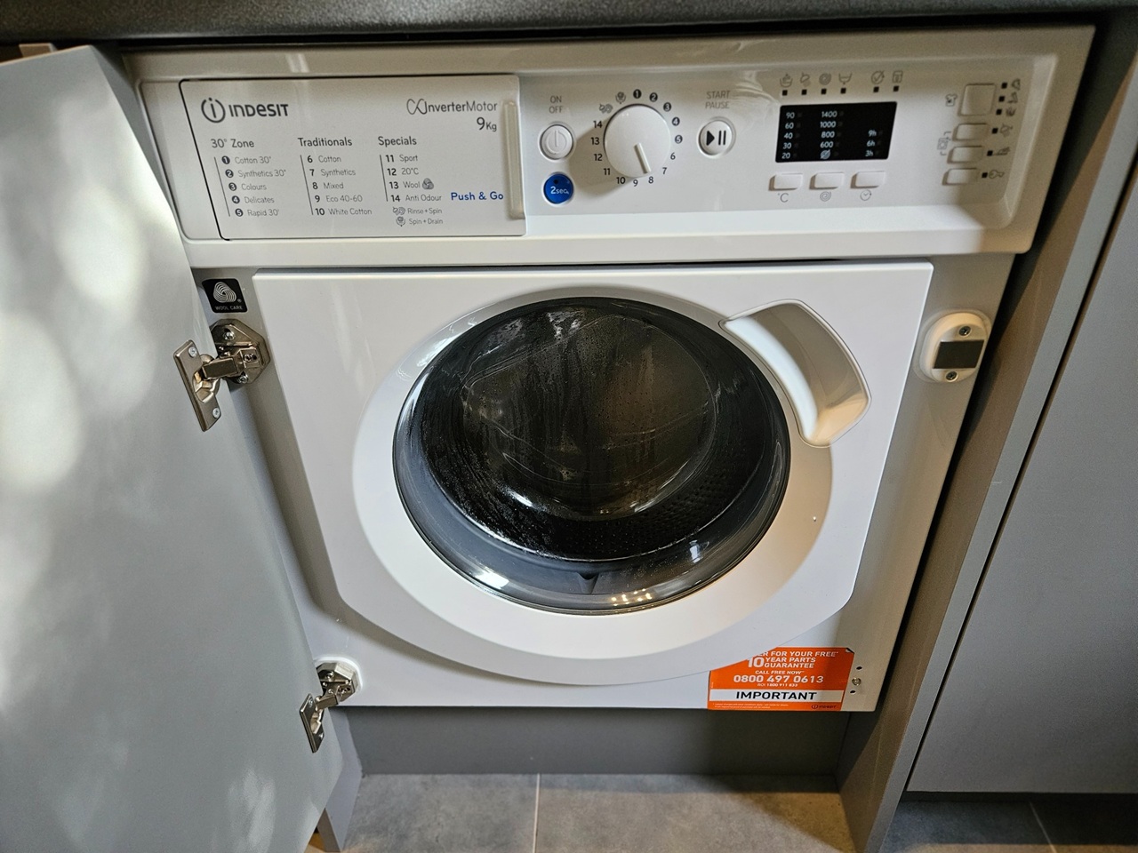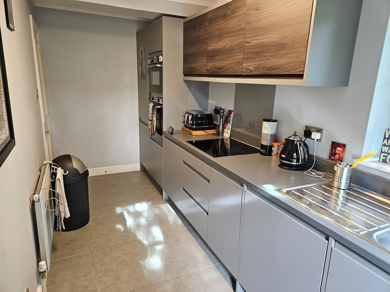 Sleek grey units, double oven and breakfast bar for two make cooking effortless, while a washer-dryer keeps luggage light.