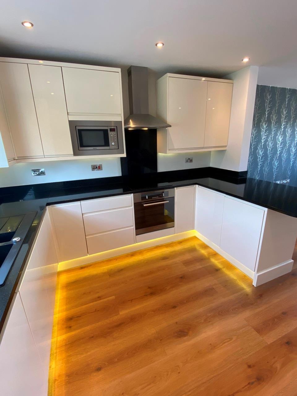 A large open plan kitchen featuring modern high gloss units with integrated handles, granite worktops, breakfast bar, integrated appliances including fridge, freezer, electric oven and hob, and dishwater. LED plinth lighting provides a luxurious feel. The spacious living room benefits from an elevated position within the property, giving stunning views both day and night.