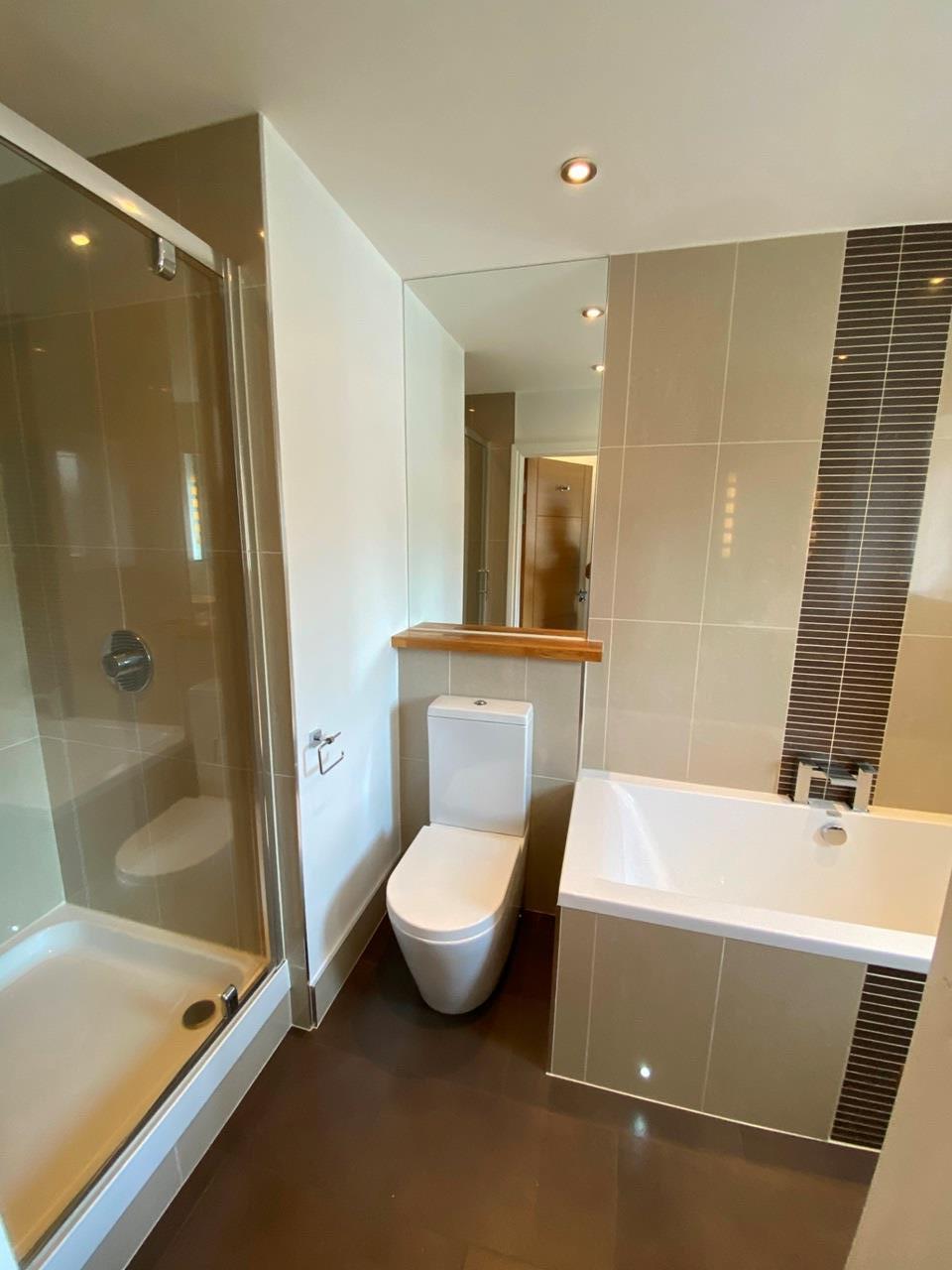 High specification modern bathroom with wall mounted TV, separate glass shower cubicle and duo-flush WC. High quality fixtures throughout including oak vanity unit with floating ceramic basin, chrome waterfall taps and LED plinth lighting to bath. Finished with stylish ceramic wall tiling, chrome heated towel rail and illuminated mirror.