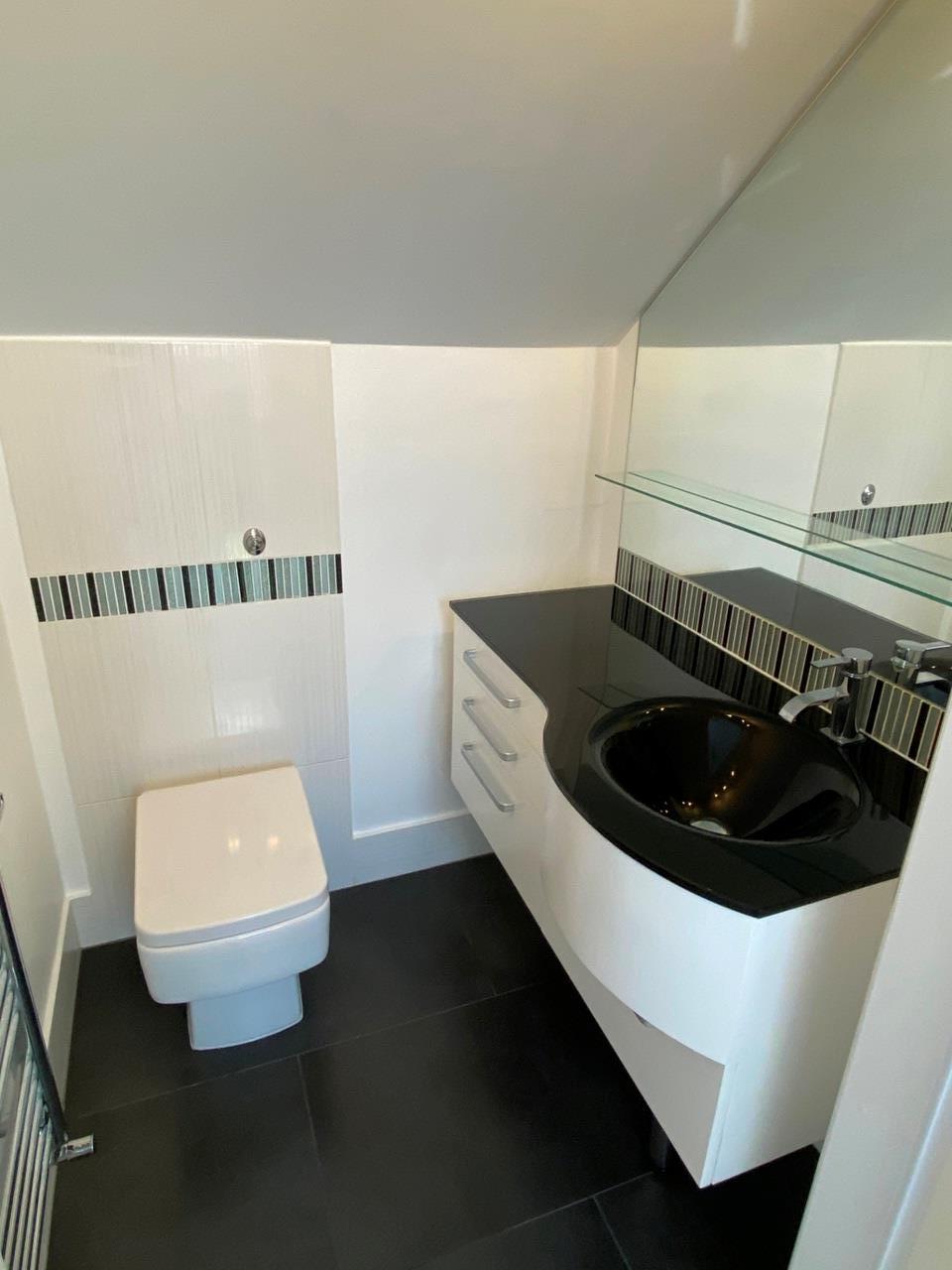Modern WC serving both upstairs bedrooms with glass vanity unit and contemporary tiling.