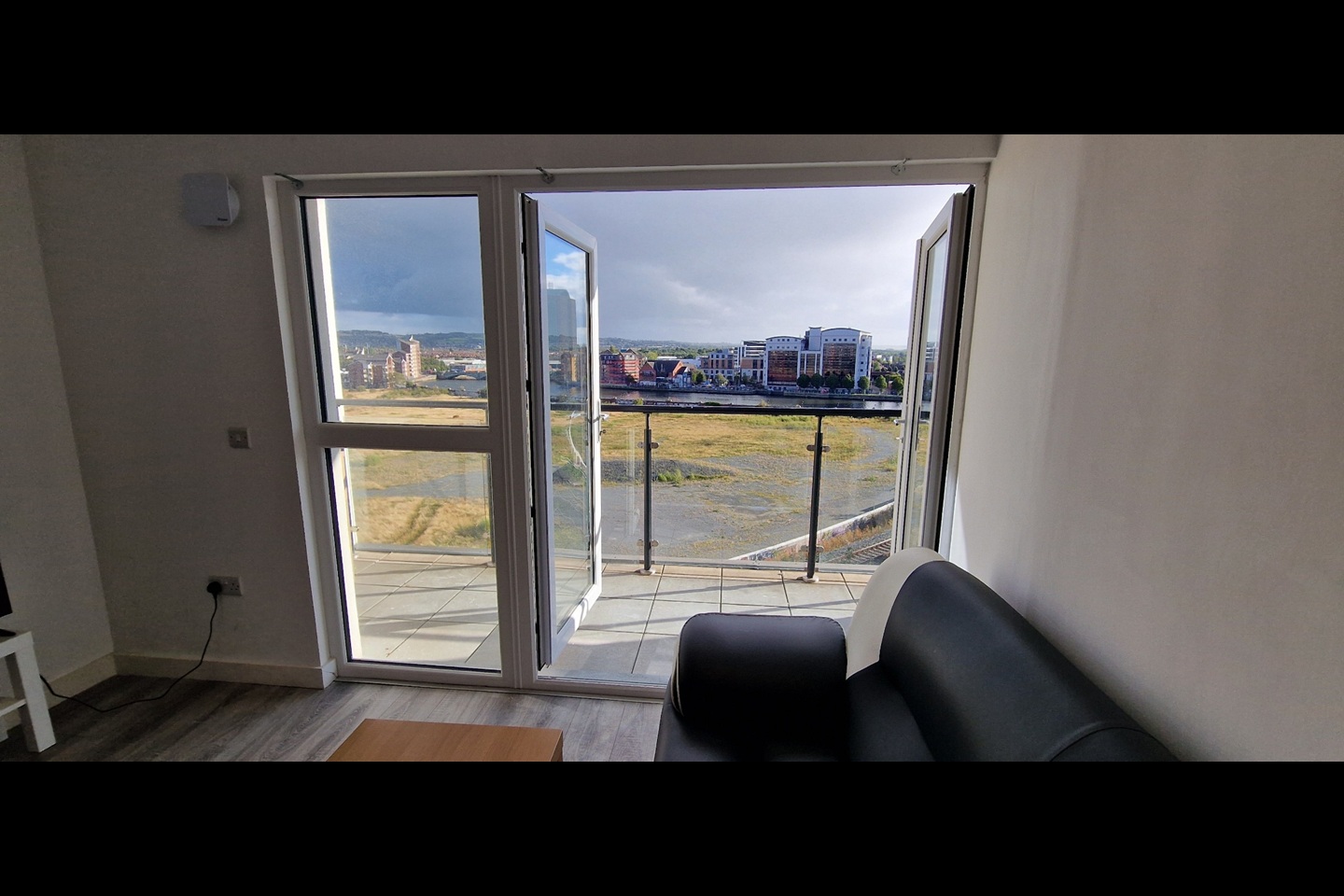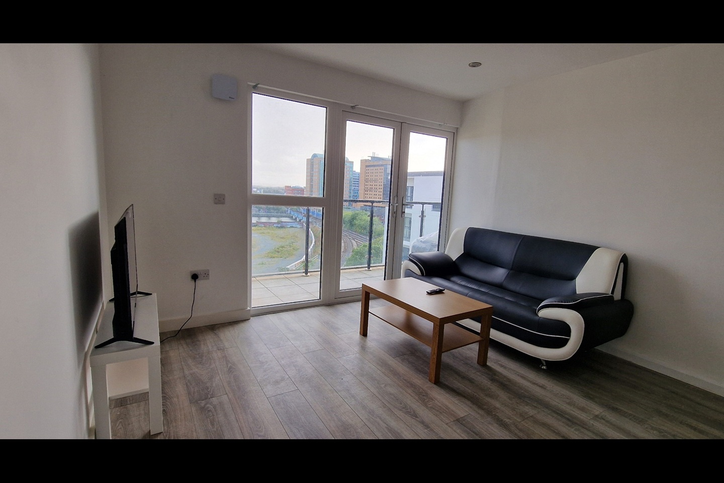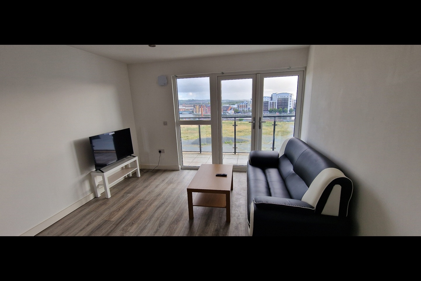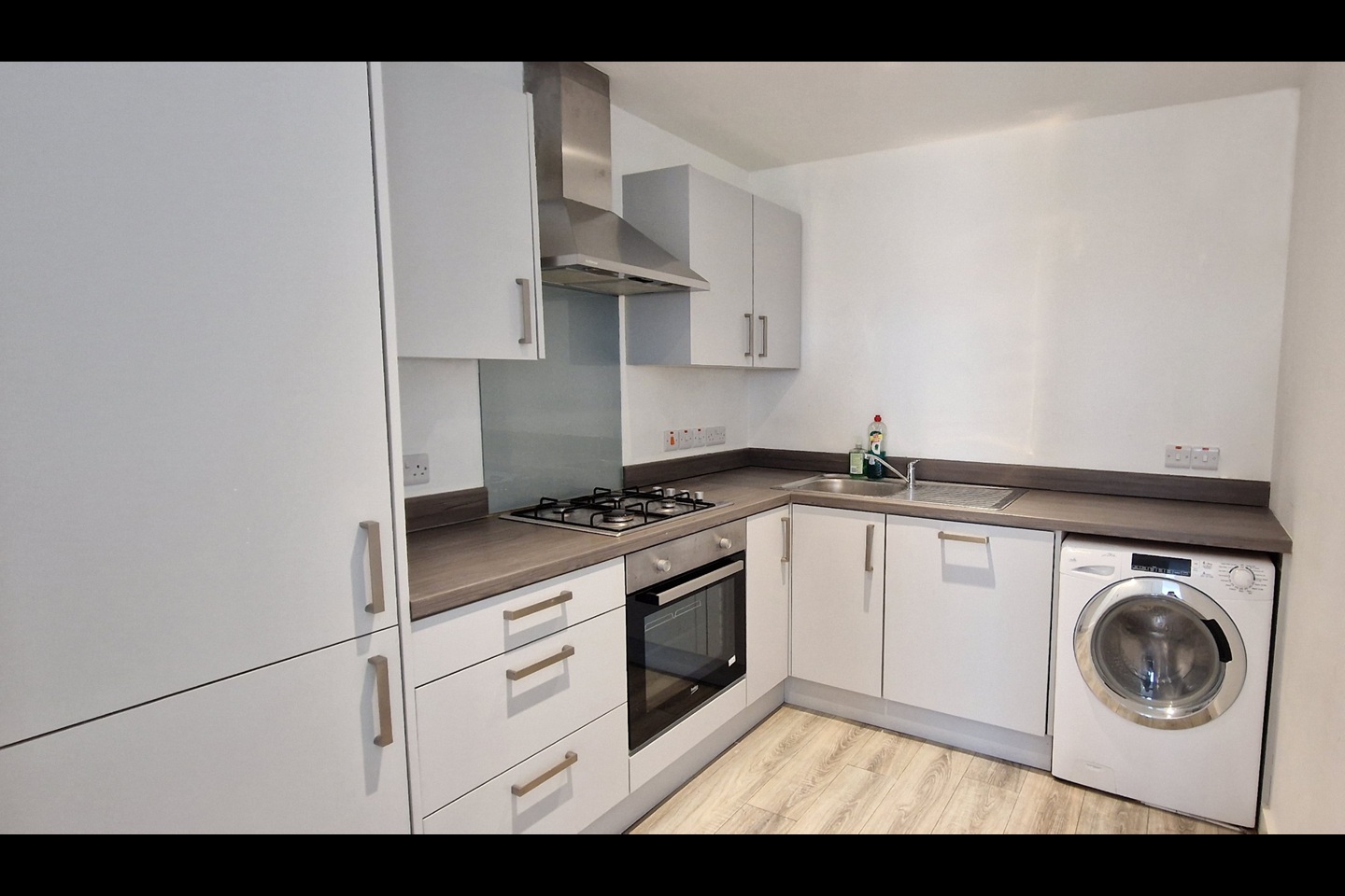Two-bedroom apartment Hallway, leading to; Open plan, Kitchen/living/dining area. Modern, Fully Fitted white kitchen, with an array of high- and low-level units, with integrated appliances, including fridge/freezer, washing machine, dishwasher, oven/hob/hood. Living area with access to balcony with stunning views.