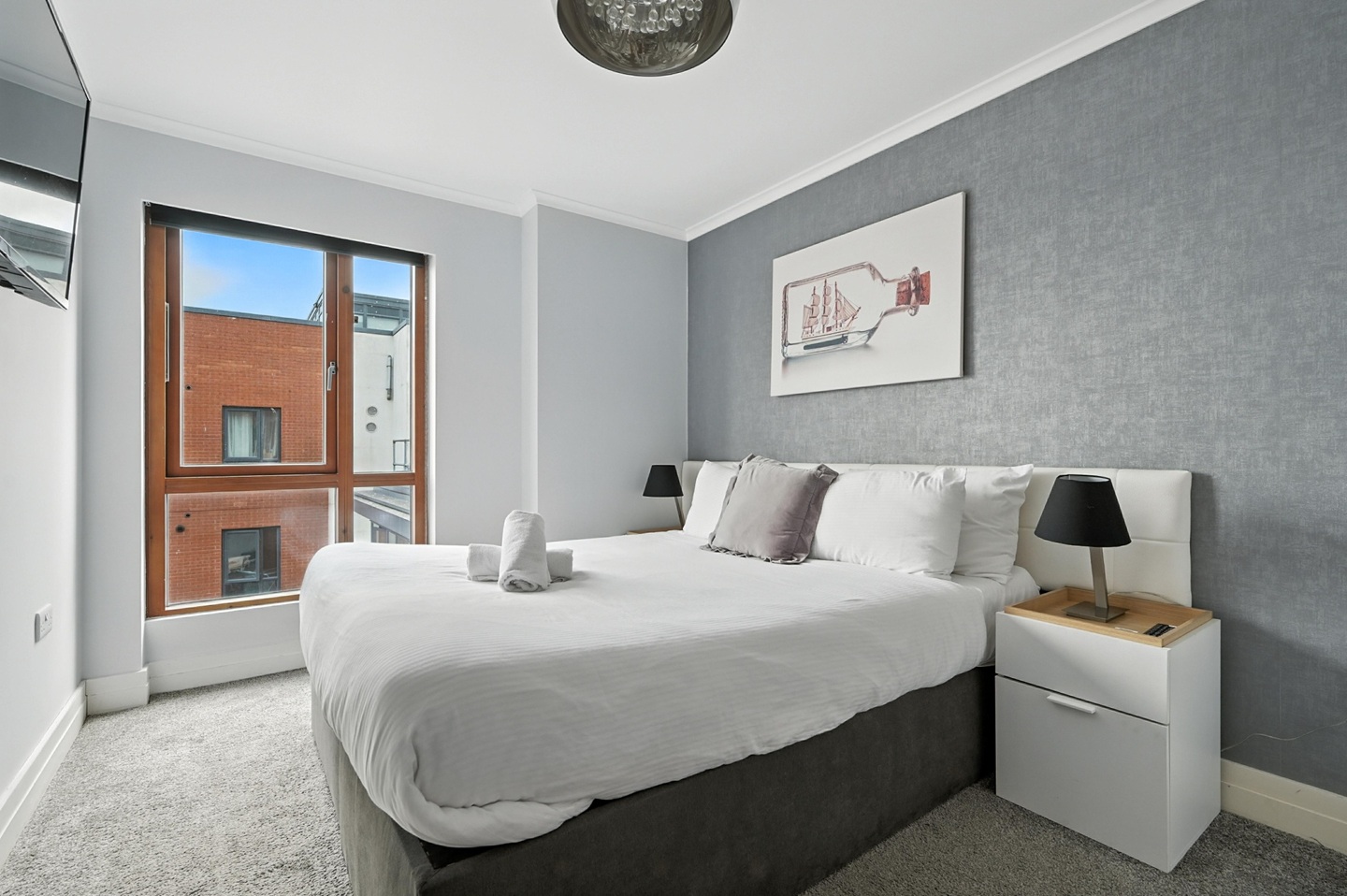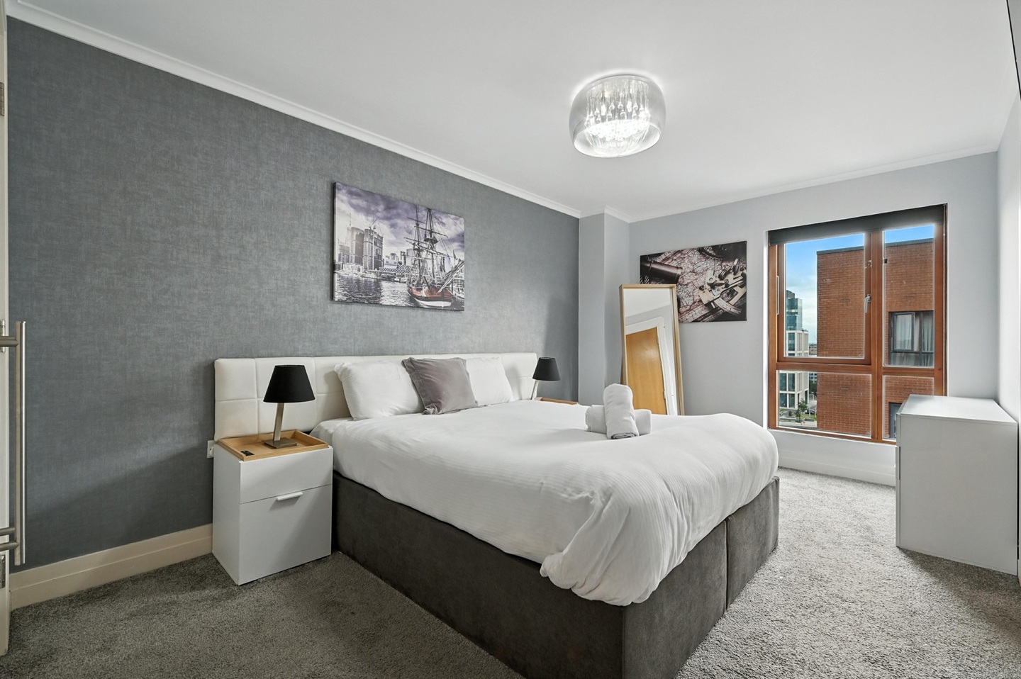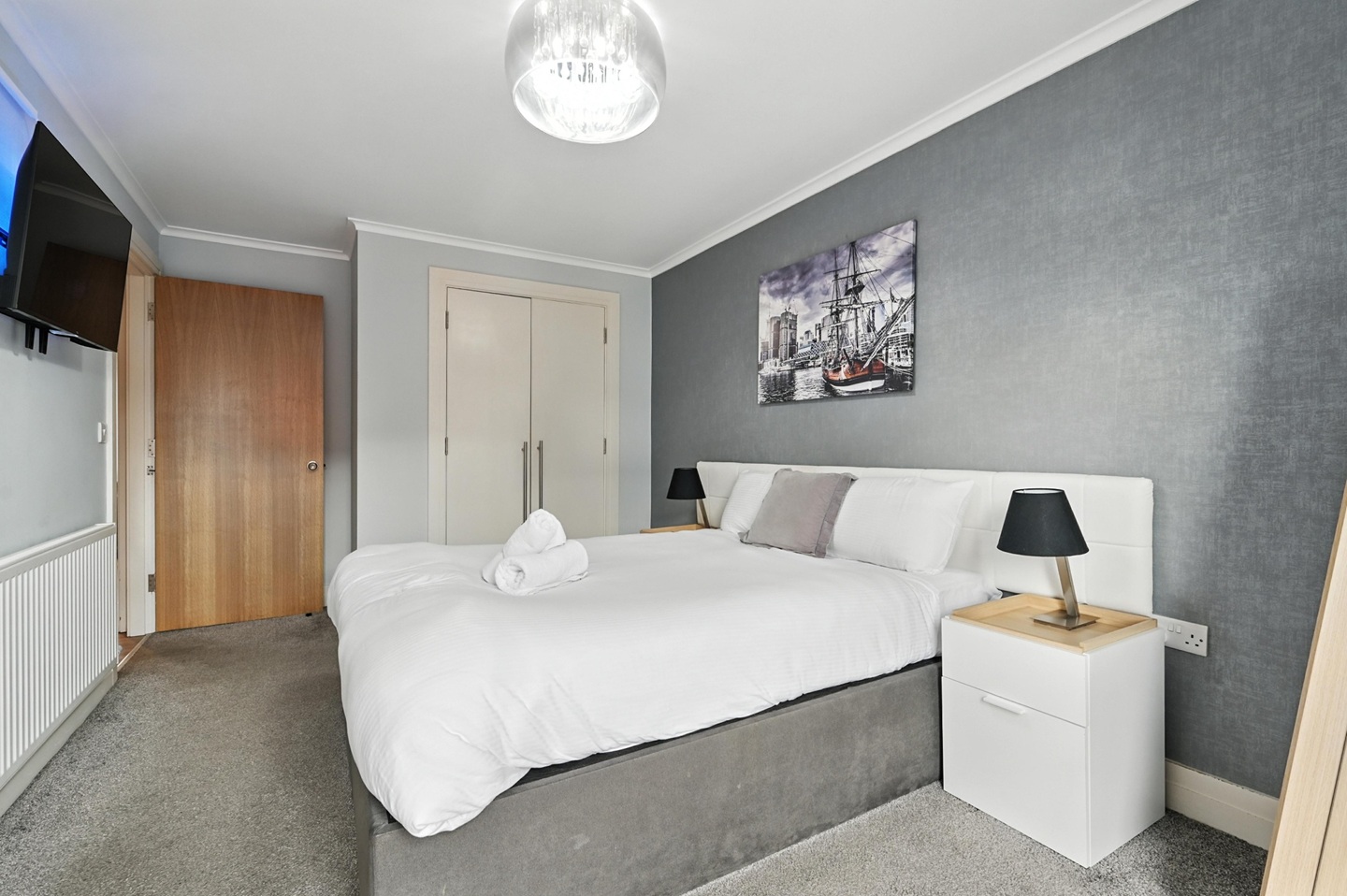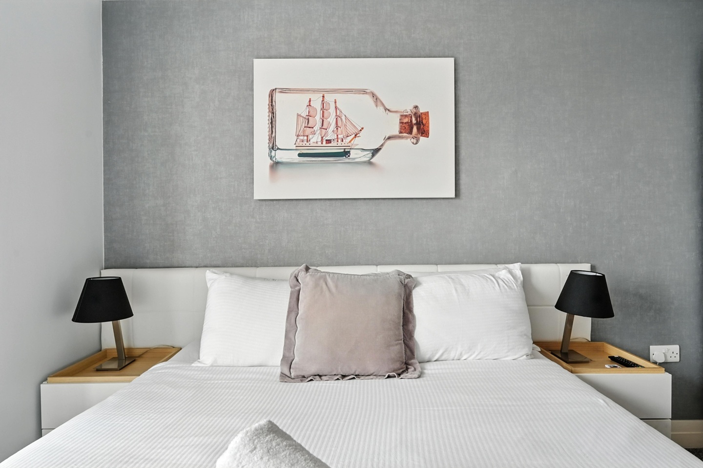 ⭐ 𝗟𝘂𝘅𝘂𝗿𝘆 𝗕𝗲𝗱𝗿𝗼𝗼𝗺𝘀: Two king-sized beds with hotel-quality white linen, bedside tables and lamps, wardrobes, and blackout curtains for a perfect night's sleep on grey carpeted floors. Both bedrooms also consist of Smart TVs for you to watch Netflix, Disney+ and Live TV. Our master bedroom also comes with an ensuite bathroom.