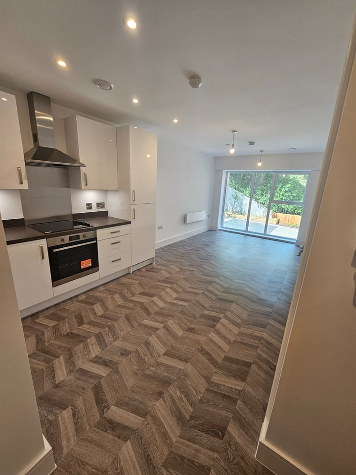 Entering the property, this benefits from a large open plan lounge/dining area with contemporary wooden flooring and floor to ceiling windows. A modern white contemporary kitchen with integrated appliances sits perfectly in an L shape of the room.