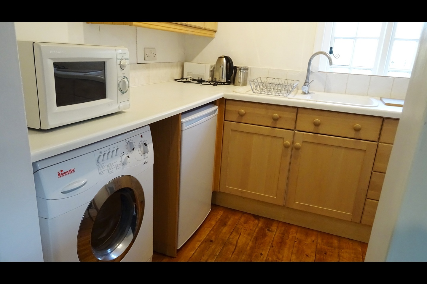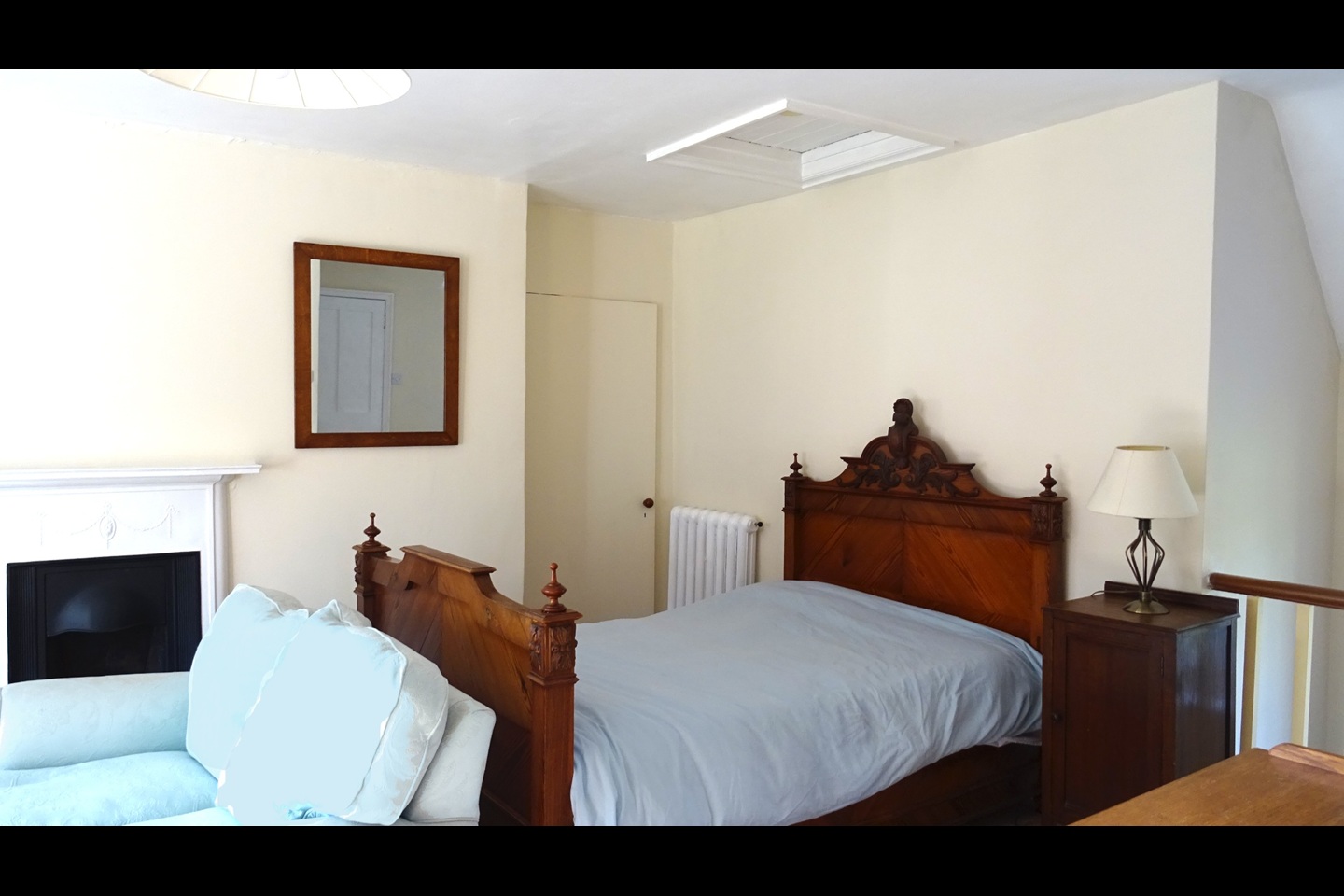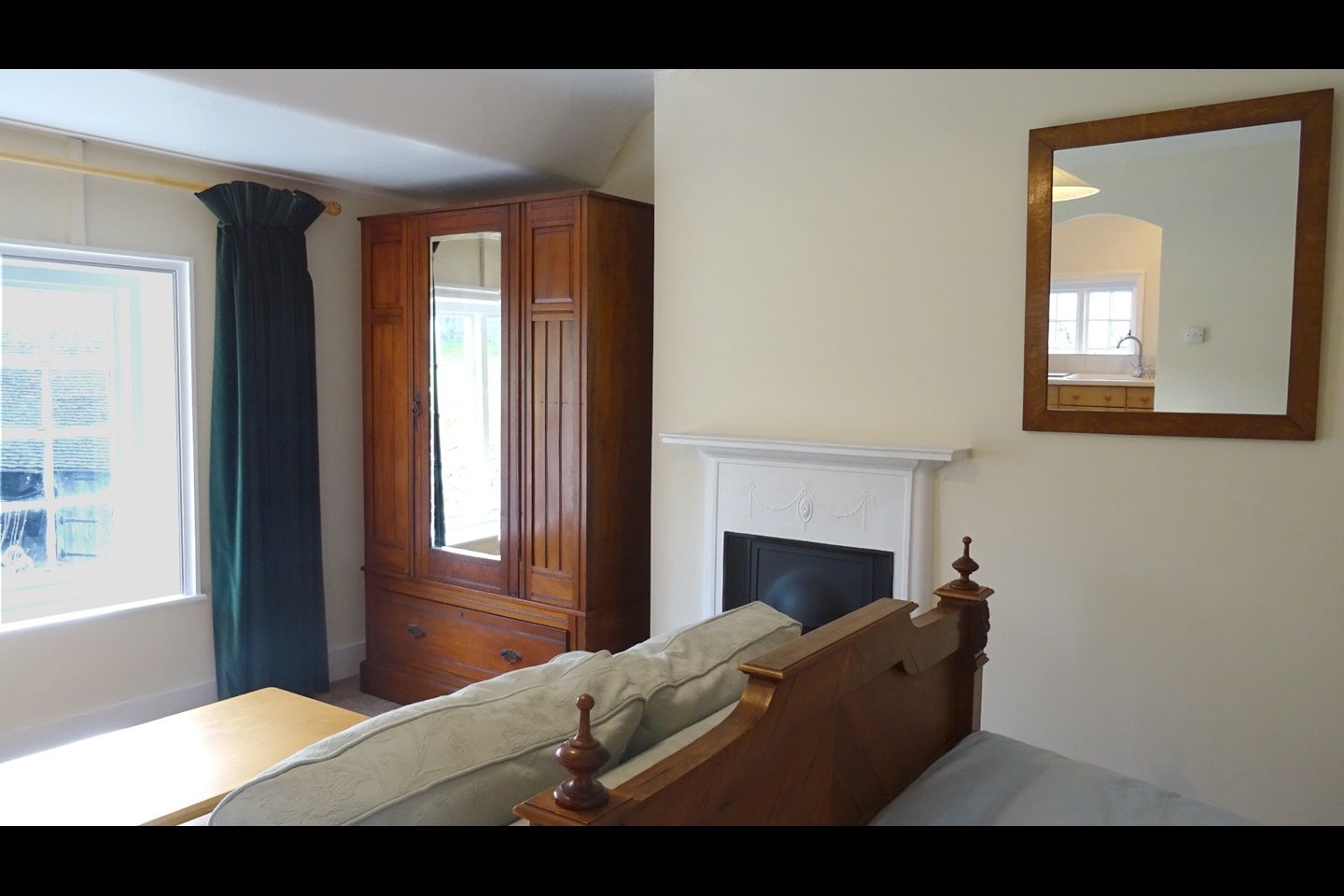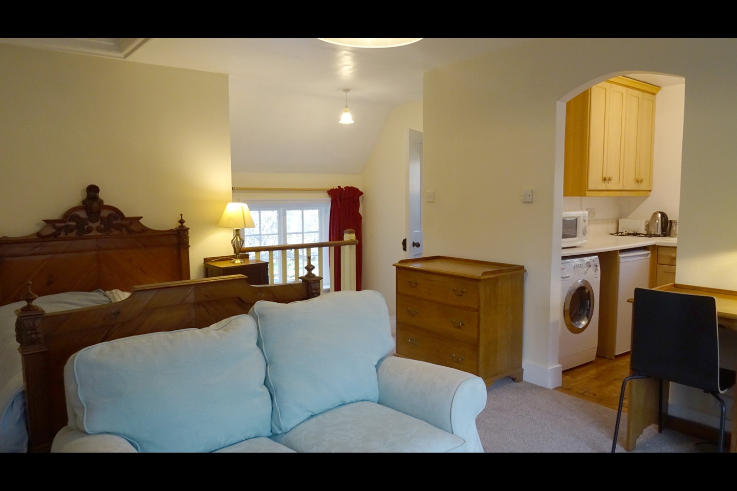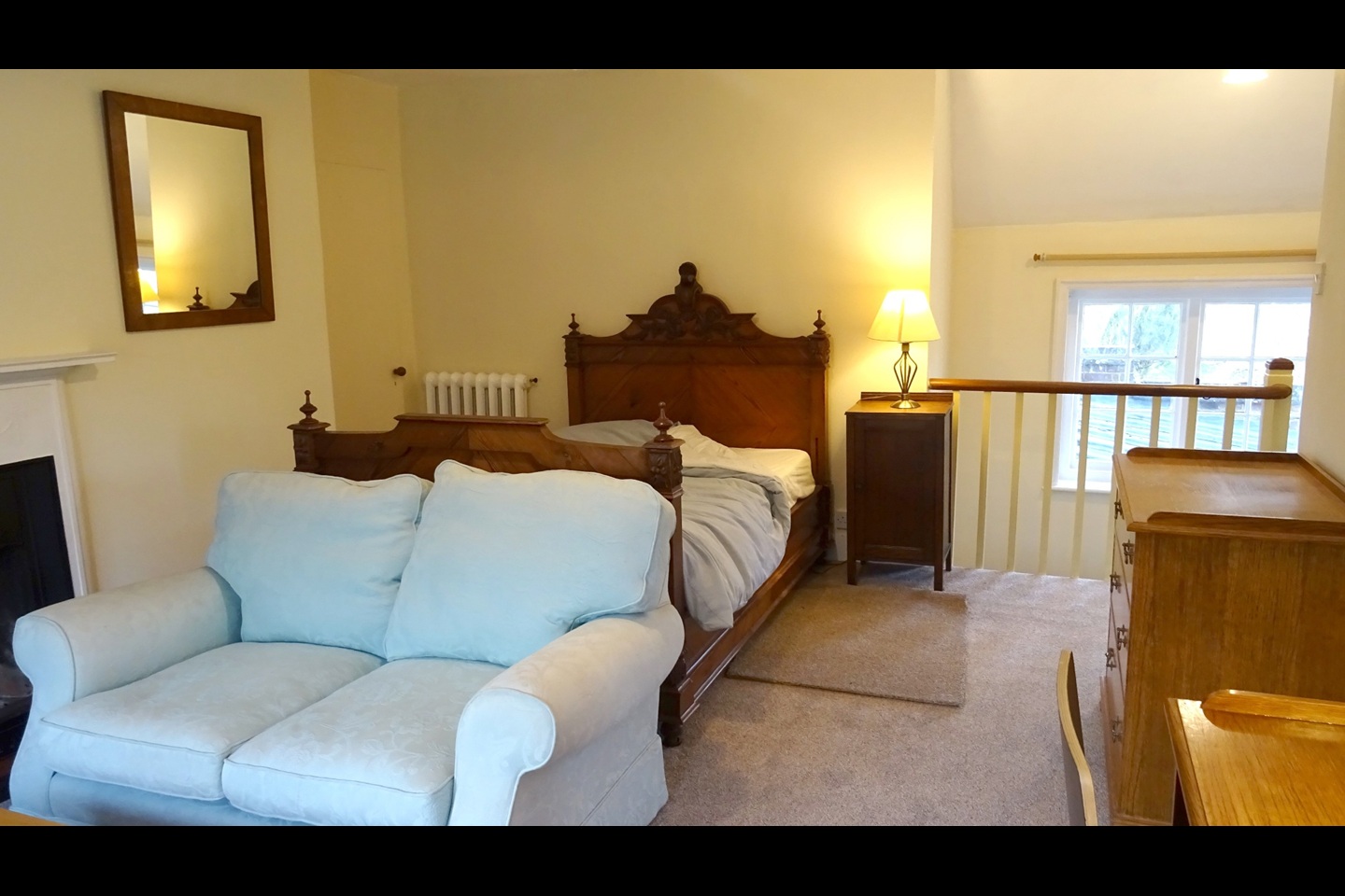 Spacious fully furnished newly decorated first floor studio/living/bedroom with separate fitted/equipped kitchen/diner and recent fitted ensuite bathroom in historic country farmhouse set in rural landscape. Suitable for single tenant only. About 7 miles south of Farnham, Surrey. Approx. 30 sq.m./300 sq ft. plus extra storage available. Separate entrance and parking. Pleasant, quiet, secure surroundings. Central heat, power and wi-fi included. Smoke alarm and fire extinguisher. Nearby convenience shopping. Town centre 1mile. Own car essential.