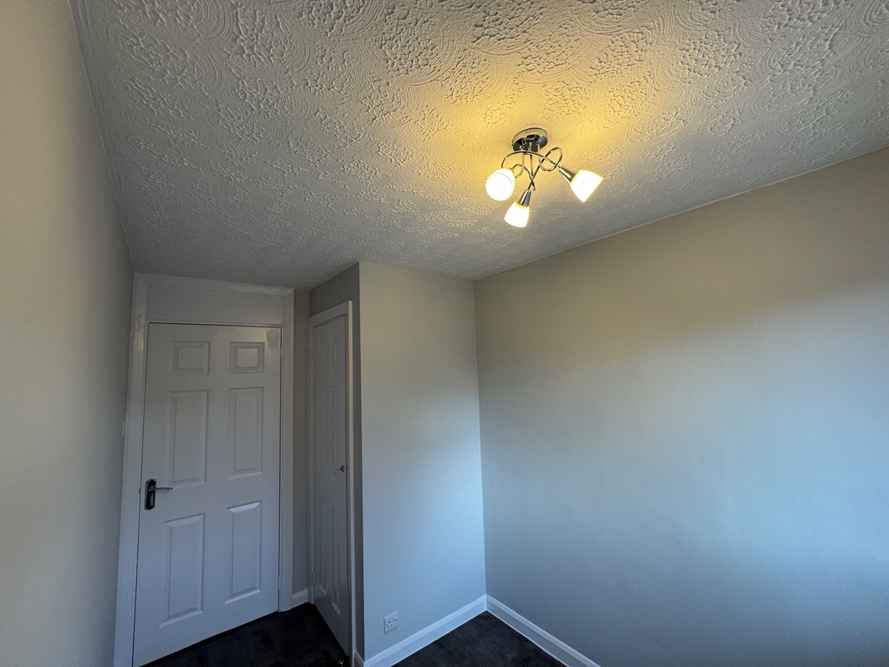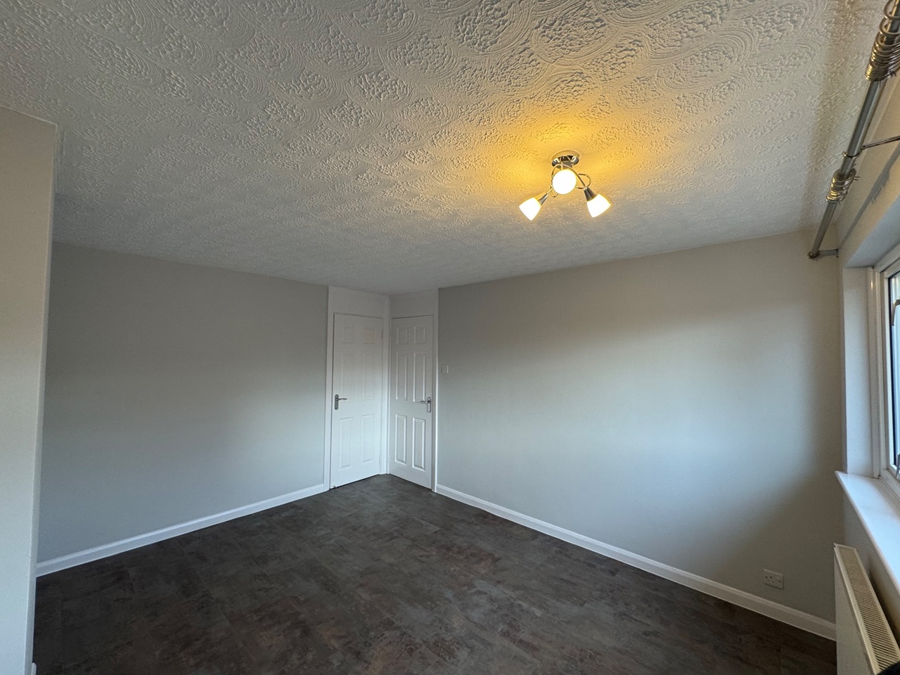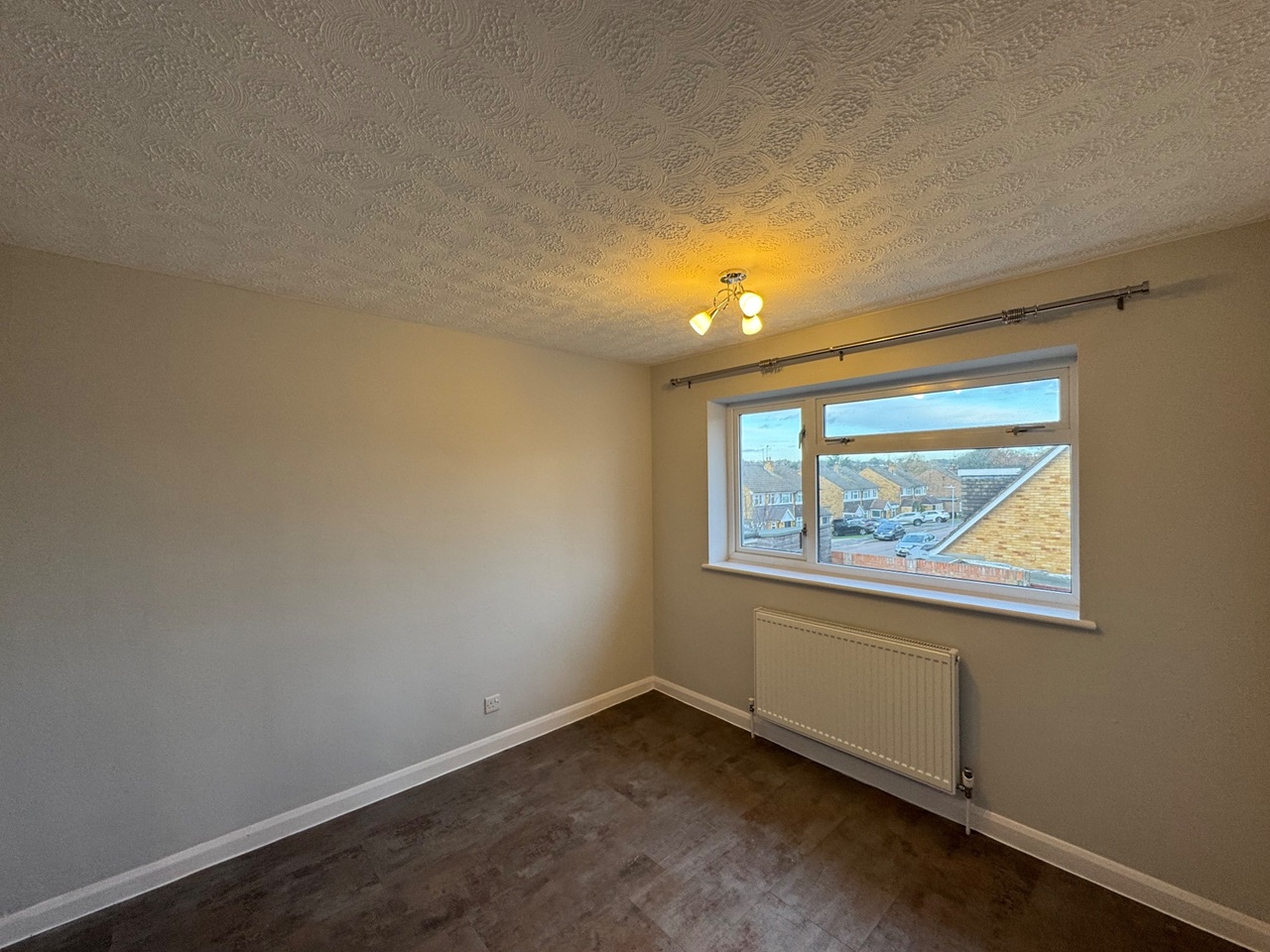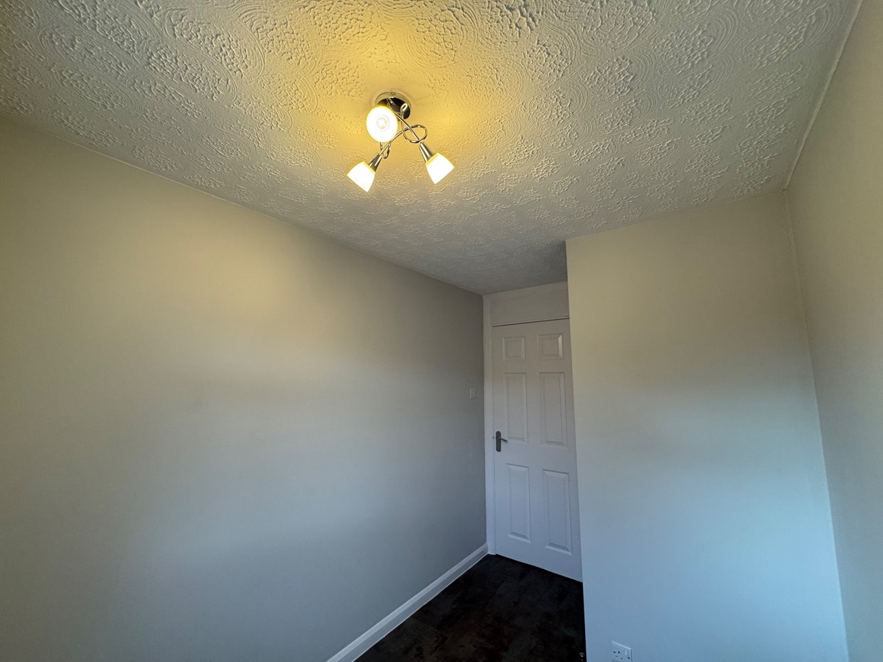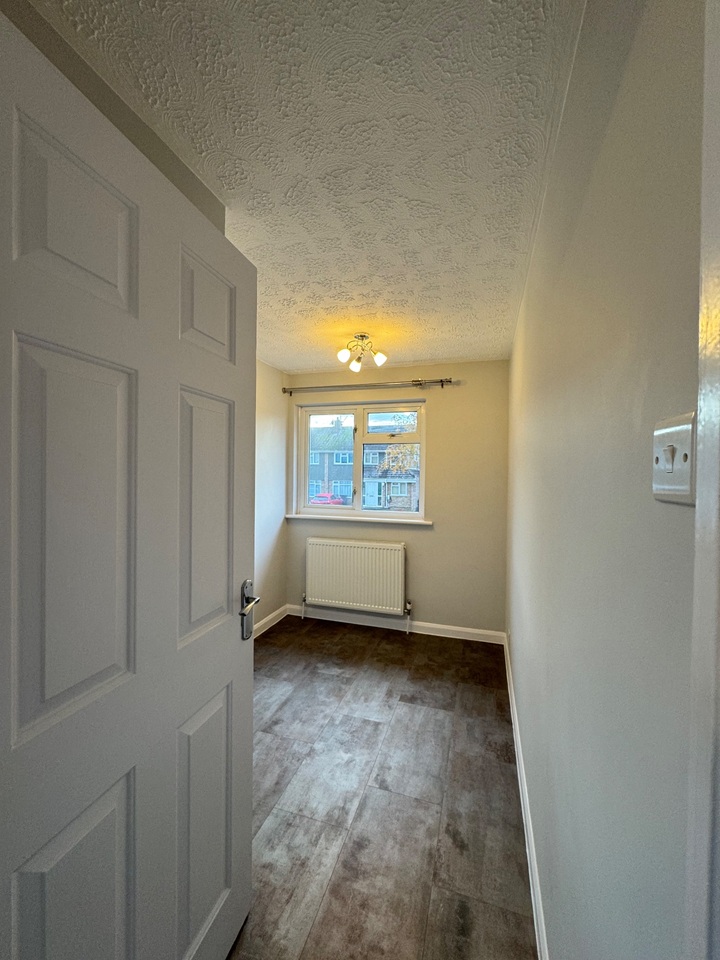 Upstairs offers three good-sized bedrooms, all newly decorated with fresh paint, new lighting, and curtain rails. The stairs are carpeted for comfort, while the rest of the property features modern vinyl flooring for easy maintenance. The bathroom has been fully updated with new fixtures, shelving, and a contemporary shower and bath setup.