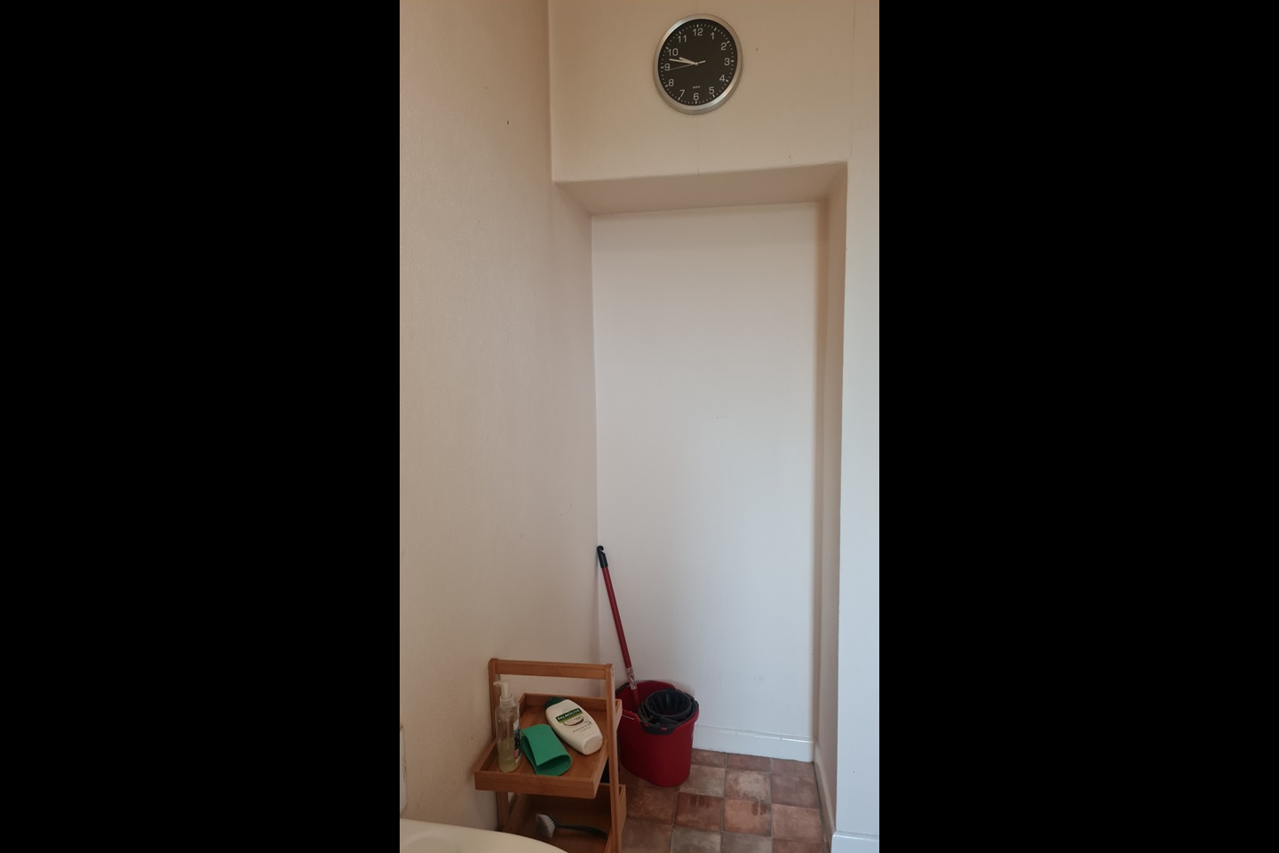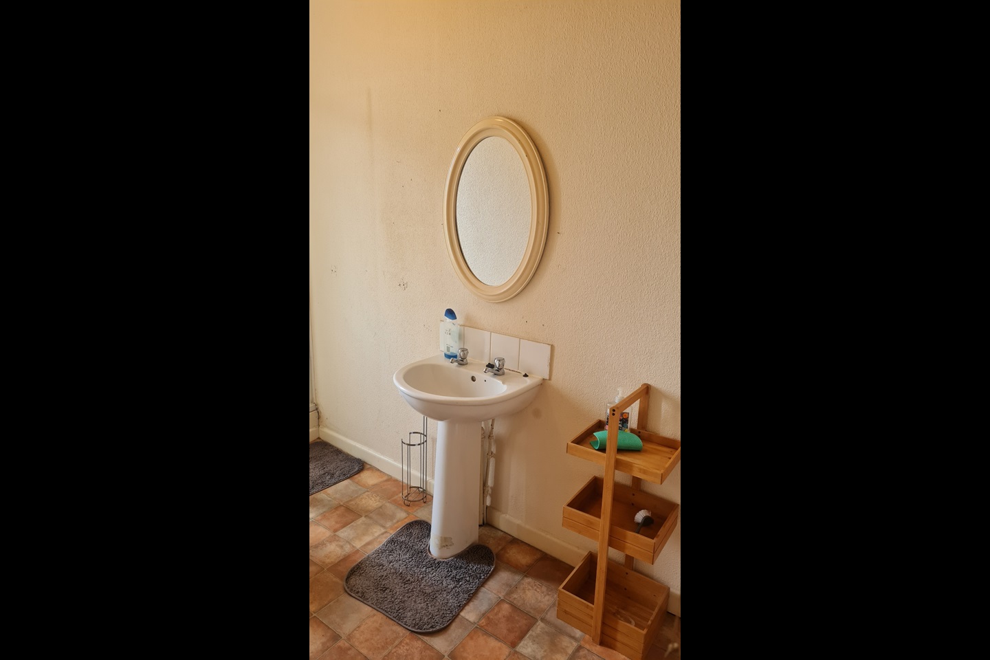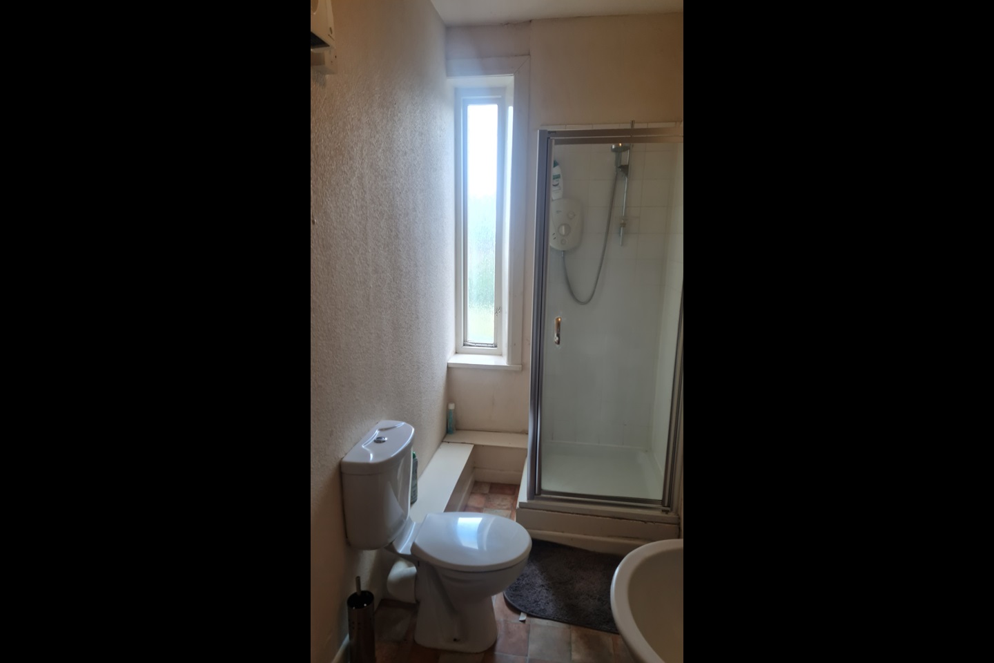 Bathroom with three-piece suite (wash basin, toilet, and shower), situated along the corridor of the flat