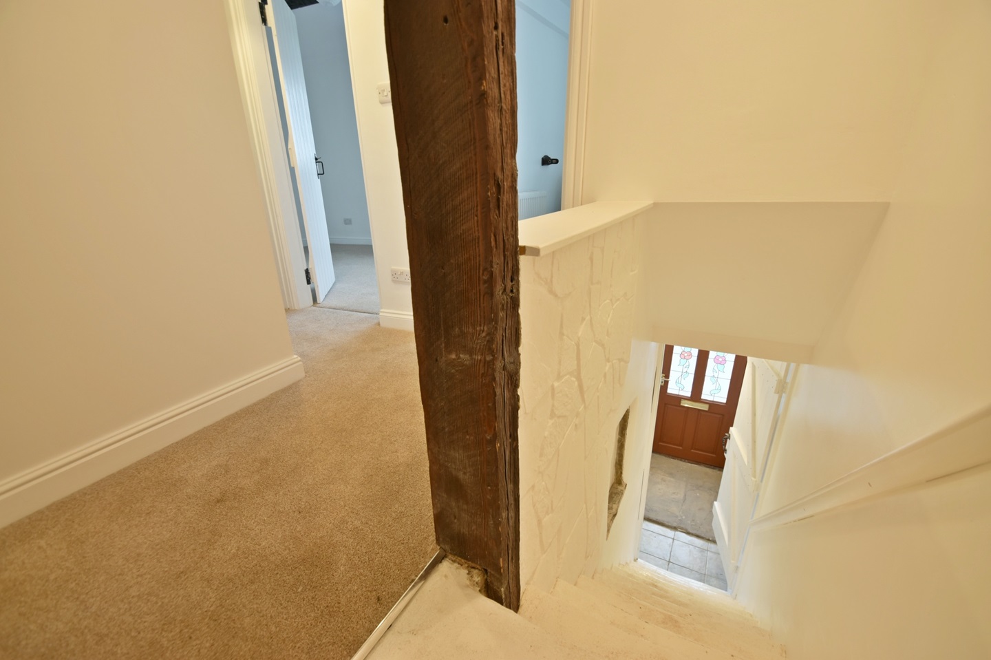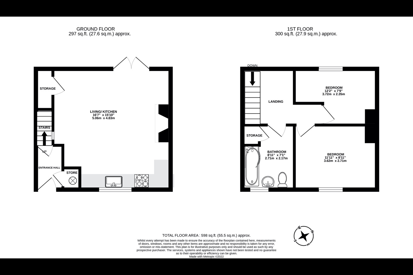 The downstairs hall leads into a kitchen / lounge with a tiled floor (5.06m x 4.83m). Upstairs is the bathroom (2.71m x 2.17m), master bedroom (3.62m x 2.71m) and second bedroom (3.72m x 2.35m).