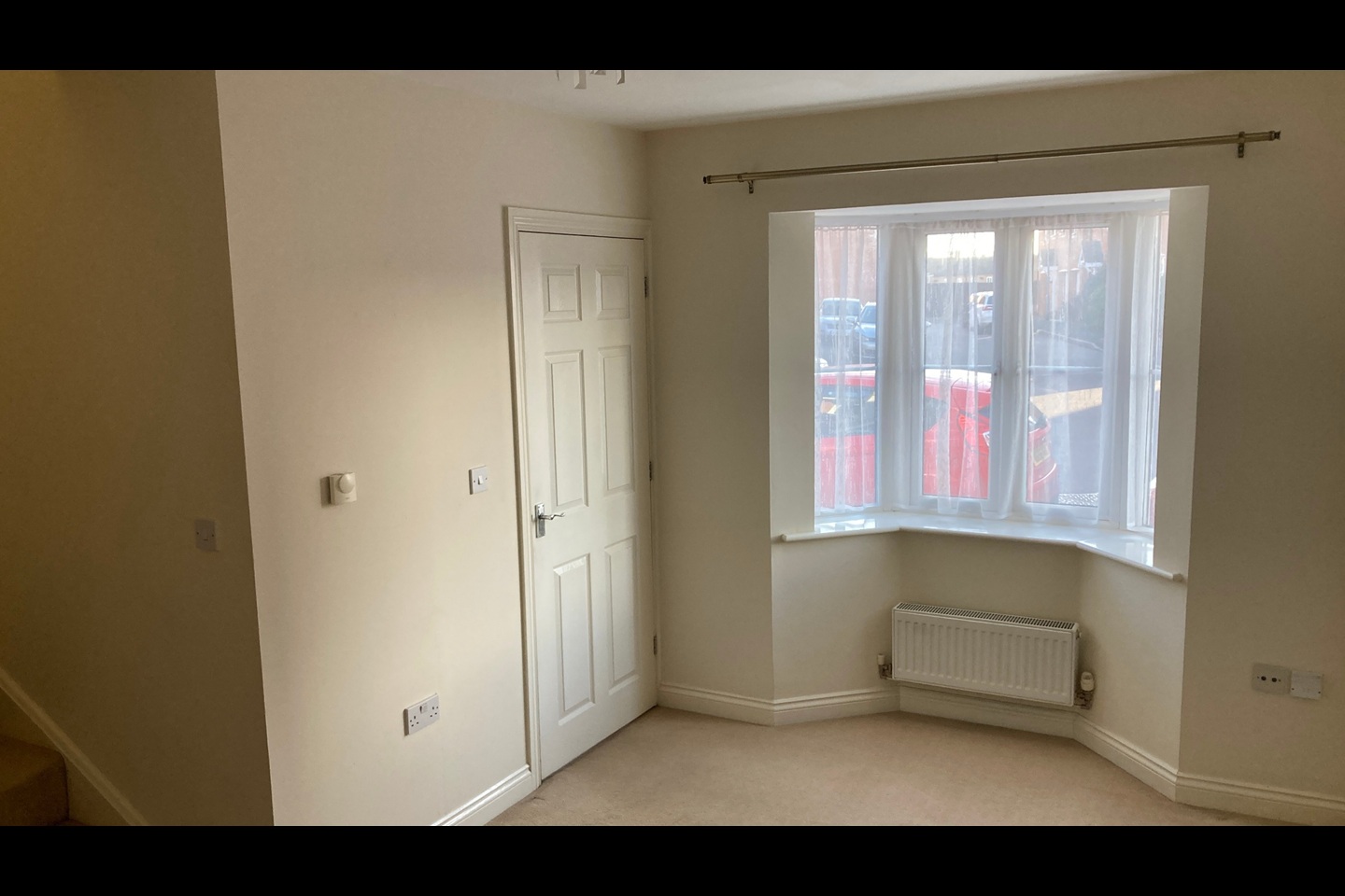 Entrance hallway, cloakroom, living room = 15'4 into bay window x 13'8 narrowing to 8'5