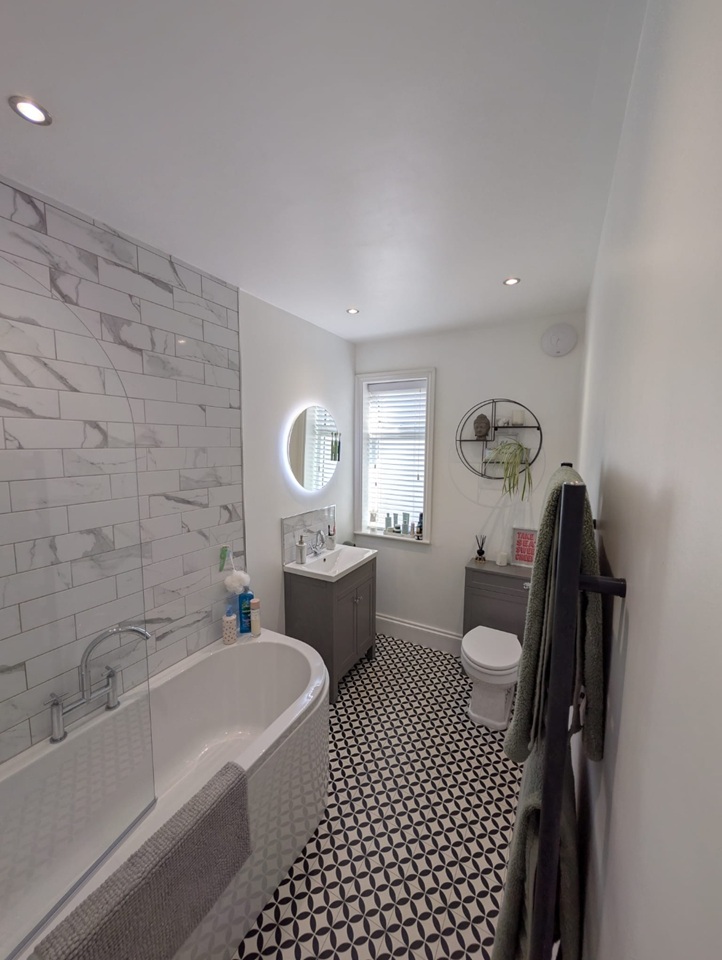 + Newly installed upstairs bathroom, which includes bath, overhead shower, toilet, sink with a vanity unit and LED mirror