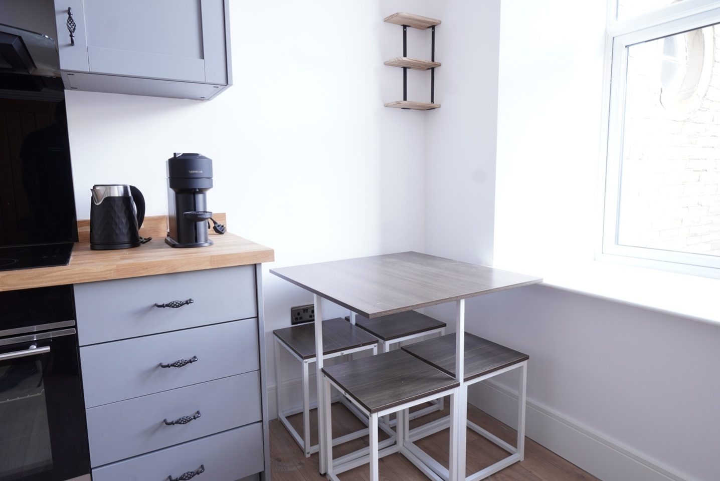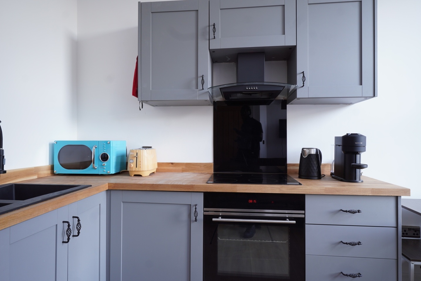 Spacious open plan kitchen/living area with large windows positioned to the side allowing room for natural light. The Kitchen is fully equipped featuring an integrated oven, ceramic touch electric hob and extractor hood with wall and base units. The durability of the kitchen is enforced with a varnished oak worktop, enhancing the kitchen's sleek design.