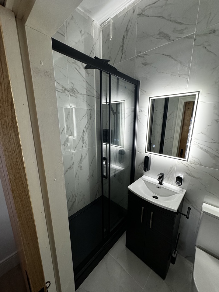 Modern 3-piece stylish suite comprising of a waterfall shower feature, WC, wash basin, light up mirror and heated towel rail.