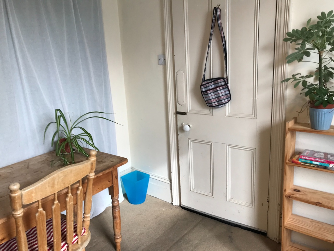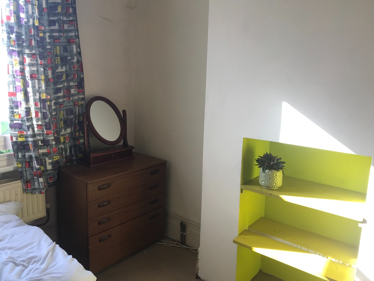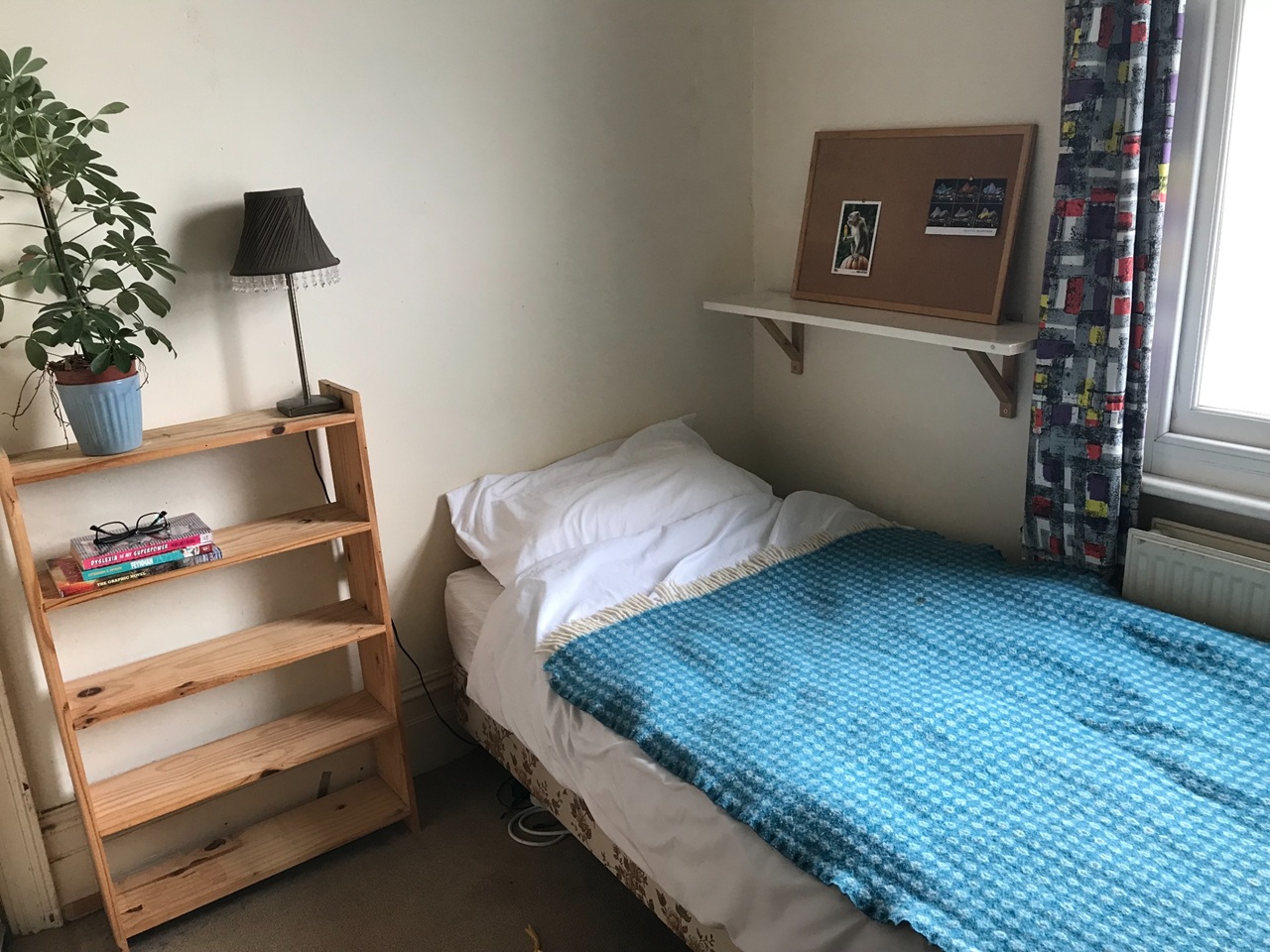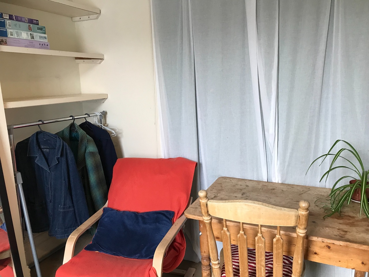 The room is fully furnished with a bed, table, chair, chest of drawers, shelves, and hanging rail. There is a washing machine in the kitchenam a non-smoker, but ok for people smoking outside.