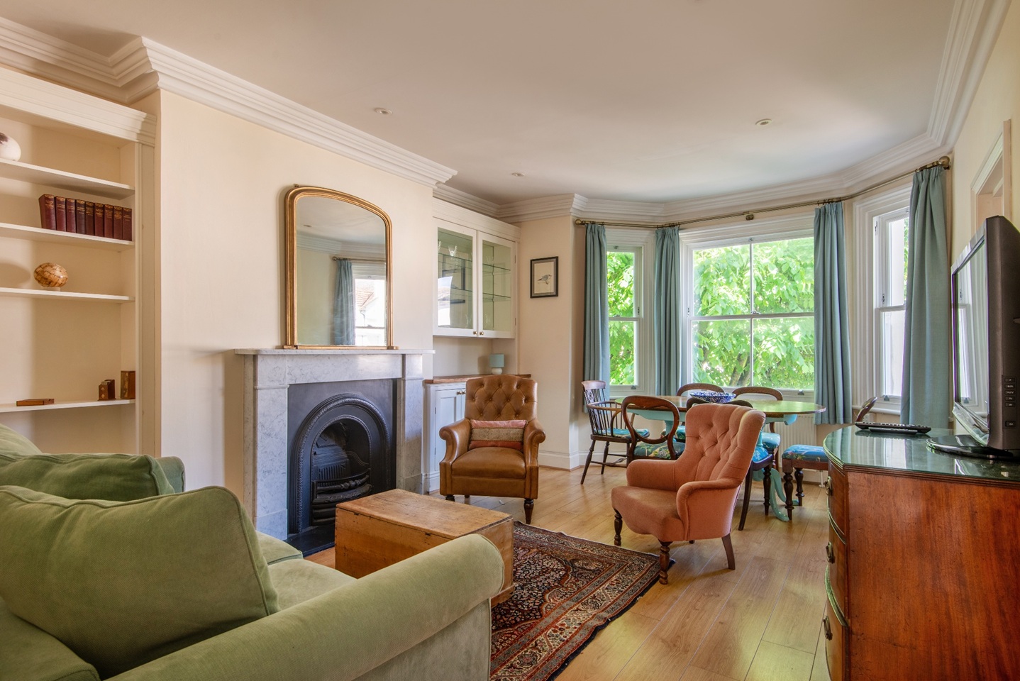 The flat features a stylish living room with bay windows, elegant period details, and comfortable seating, along with a fully equipped kitchen offering modern appliances and plenty of storage. There are two contemporary bathrooms (one en-suite) and three generous double bedrooms, all tastefully furnished and filled with natural light.