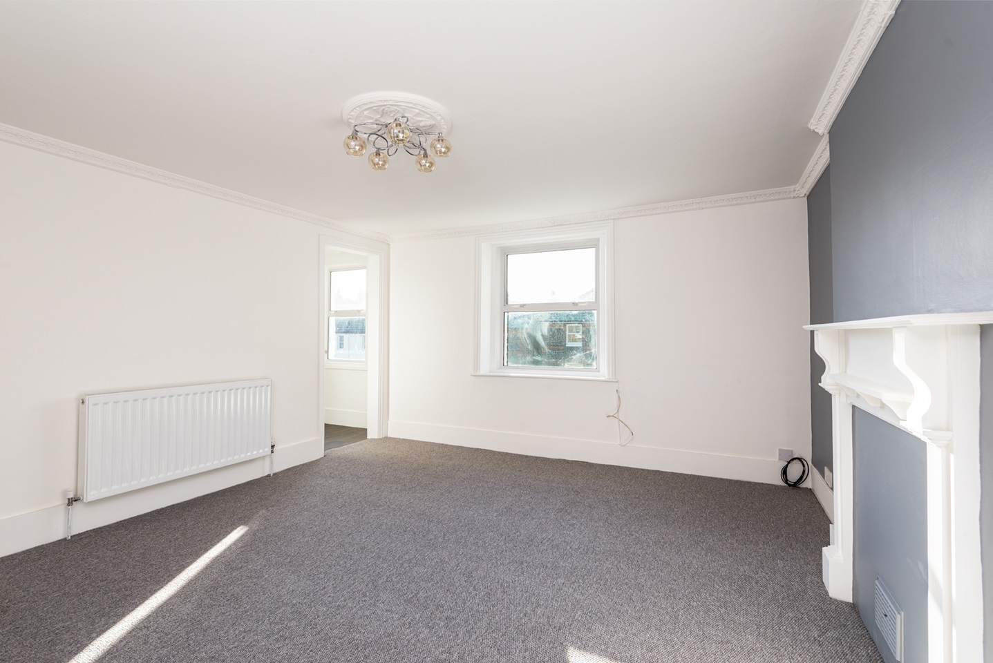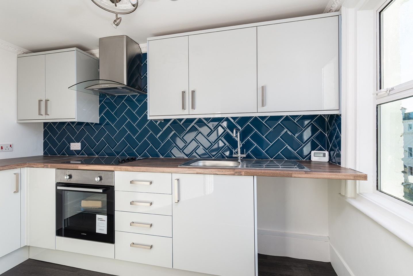 This mid-floor flat has partial sea views from the front room, a large kitchen area with modern design and an open floor plan.
