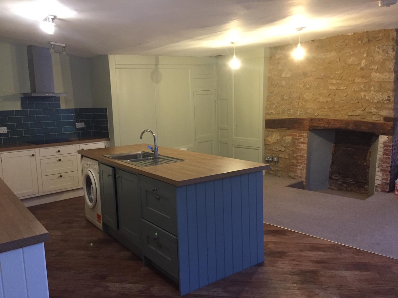 The first floor comprises a spacious lounge with a striking feature fireplace, a large kitchen with a central island and integrated appliances (dishwasher, fridge, and freezer), a cloakroom, and a generous double bedroom.