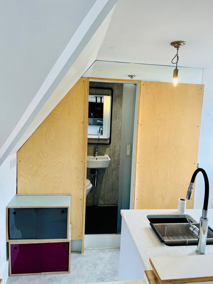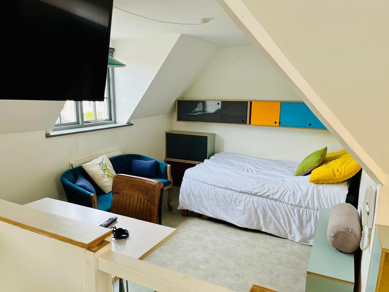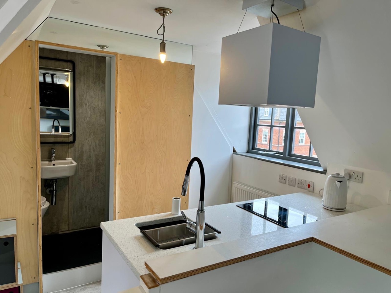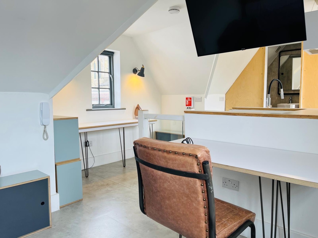Apartment includes double bed, En suite bathroom, Kitchette, Oven, Flat screen mounted TV, and Intercom system.