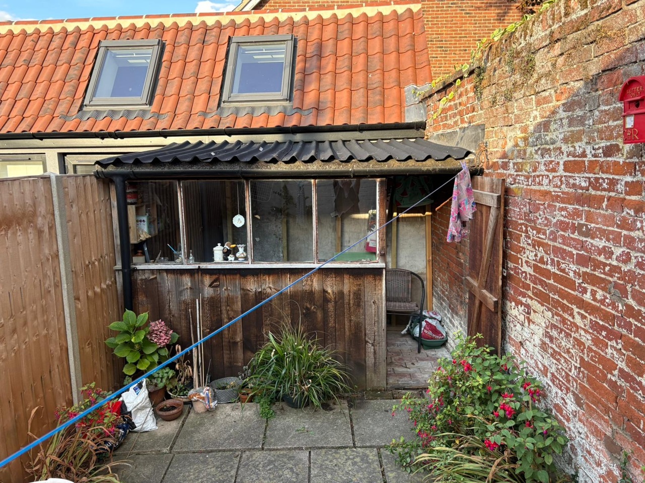 Low-maintenance patio garden with a shed, including power and electricity