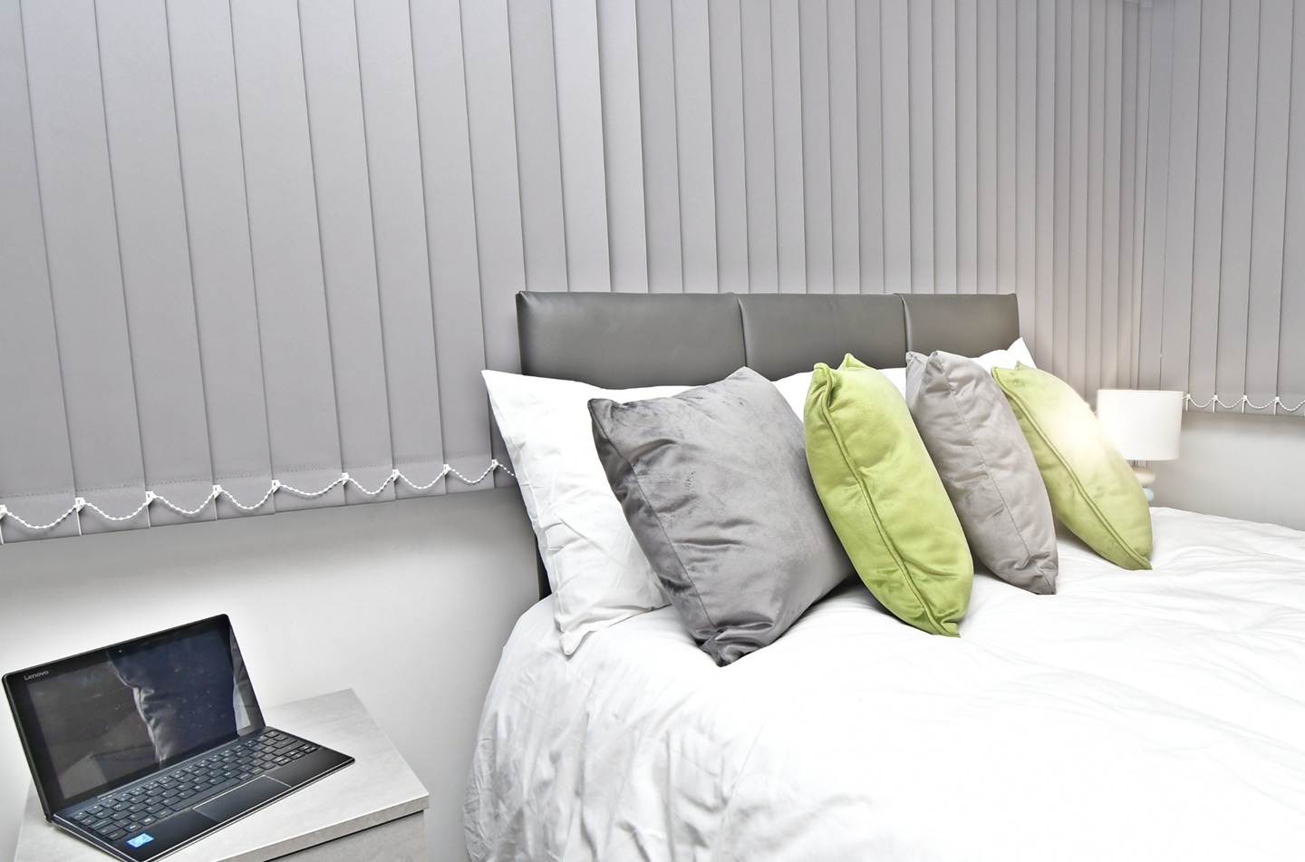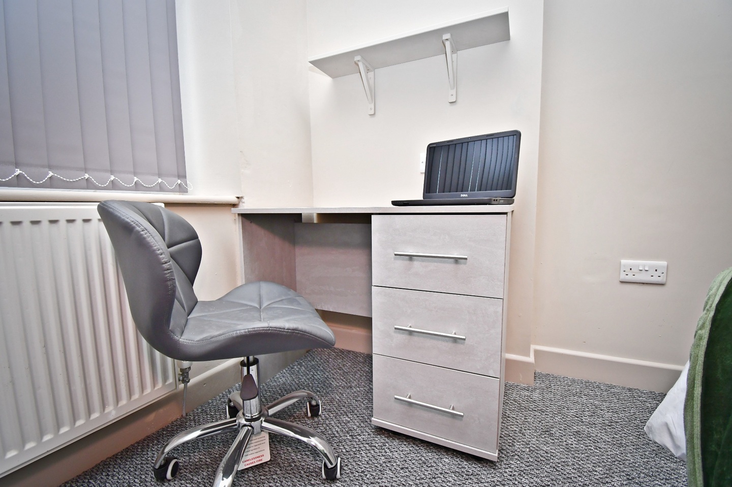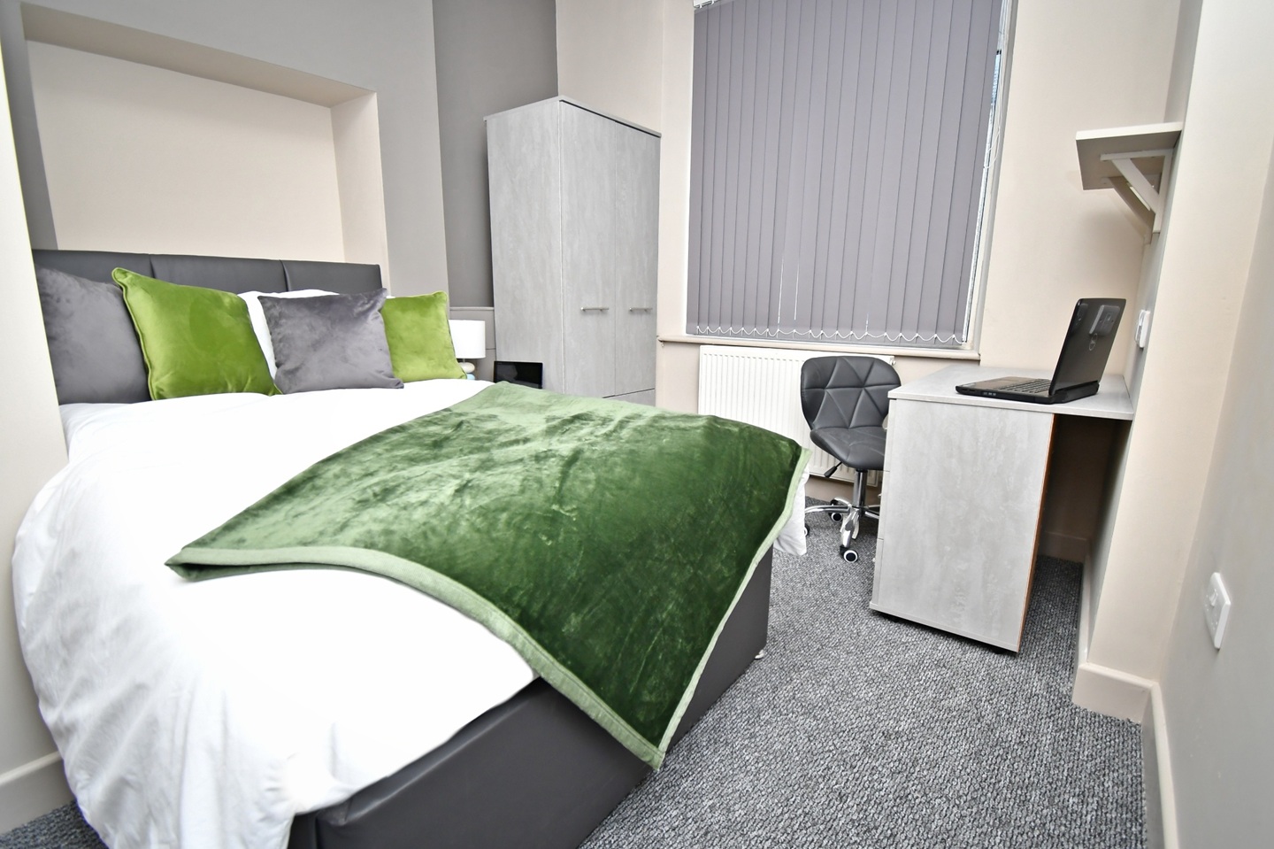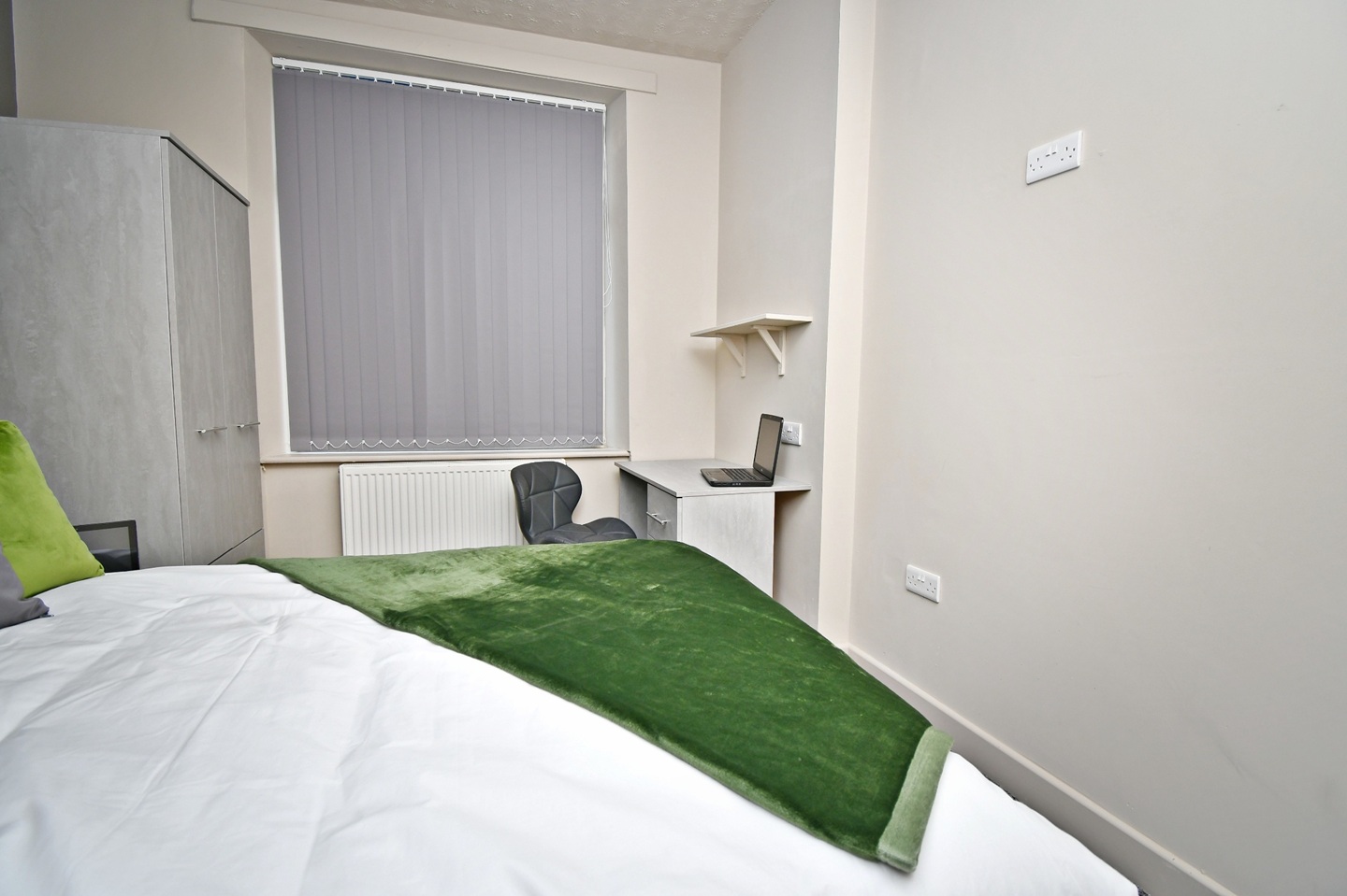A bright, modern space with a double bed, wardrobe, desk, and bedside table - ready to move straight in.