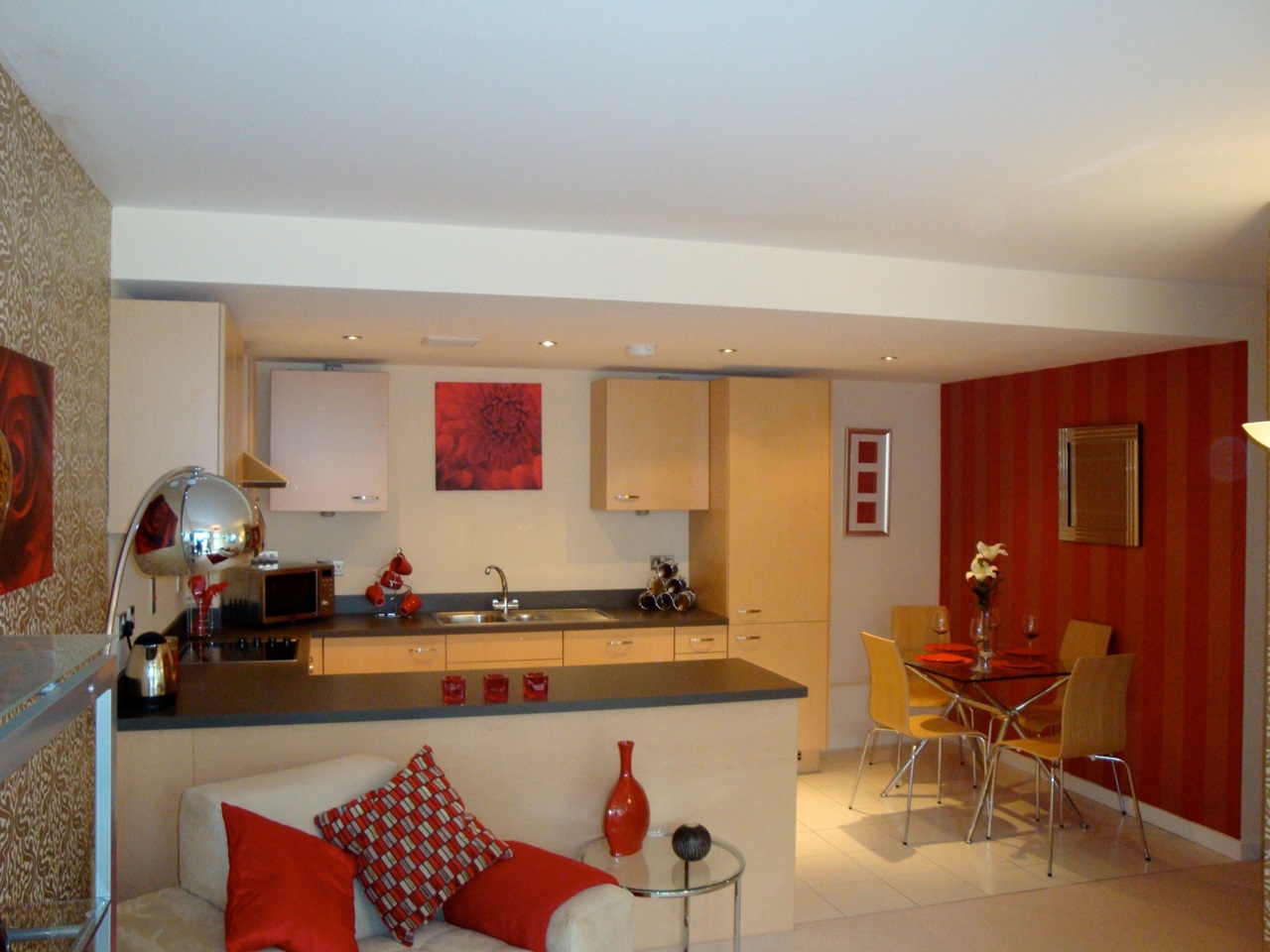 OPEN PLAN KITCHEN/LIVING AREA: Easy Clean Tiled Floor Area. Vaulted Ceiling. Kitchen Cupboards and Base Units. 1 ½ Bowl Stainless Steel Sink with Drainer and Chrome Mixer Tap. Integrated Electric Oven. Integrated Electric Hob. Stainless Steel Cooker Hood Extractor Fan. Integrated Fridge/Freezer. Integrated Washer/Dryer. Integrated Dishwasher. Cable TV Connection. Wall Mounted Electric Heaters. Smoke Alarm. Vertical Blinds. Full Balcony with Fantastic View over the shopping street and square below!