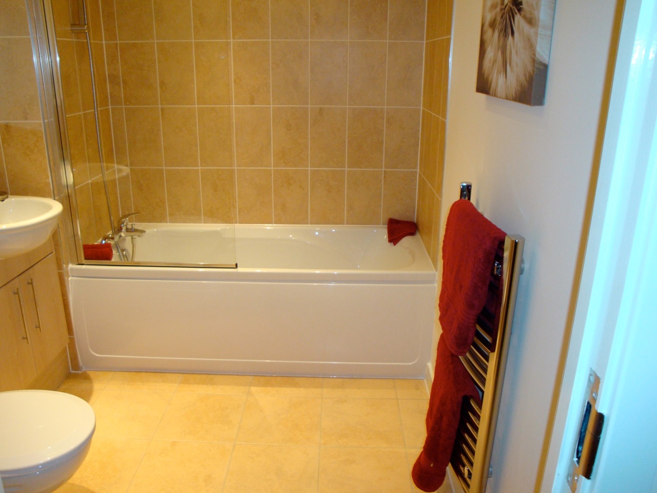 BATHROOM: Easy Clean Fully Tiled. Bath with Shower Over. Wash Basin Set In Vanity Unit. W.C. Additional Storage Cupboards. Chrome Towel Rail. Electric Shaver/Razor Point.