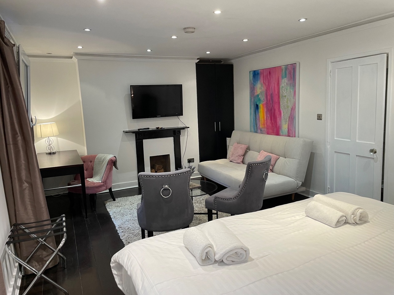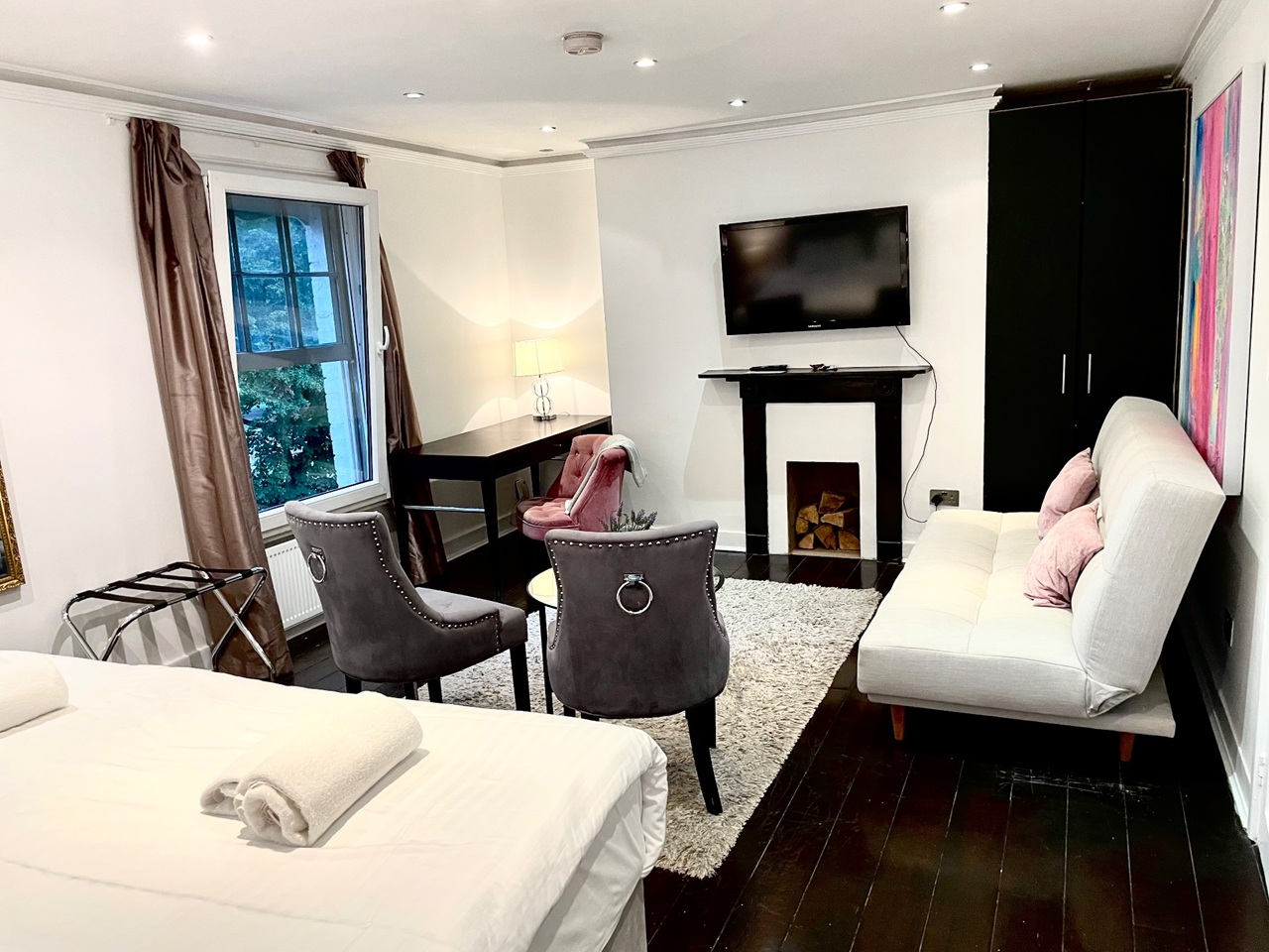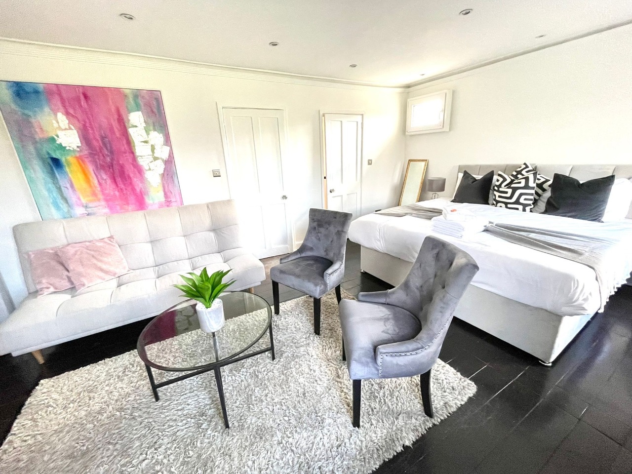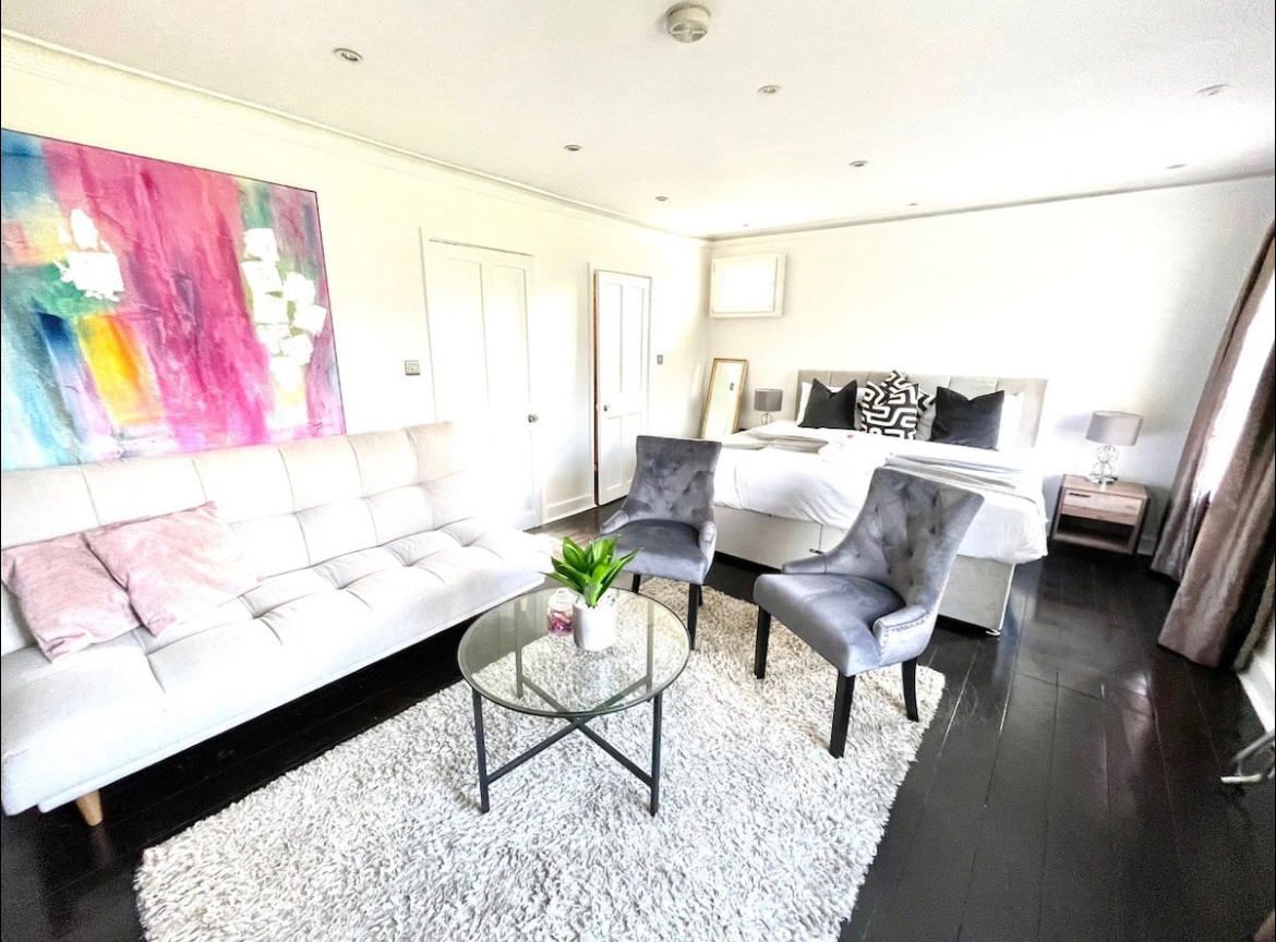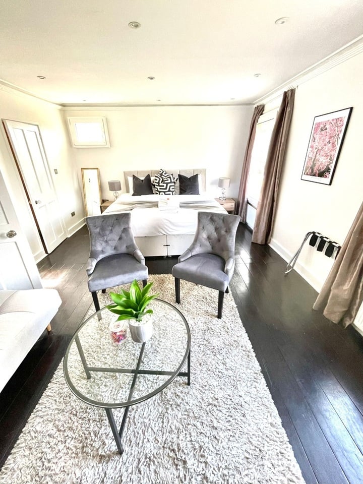 - The living area and bedroom share one beautifully arranged space (studio-style).
