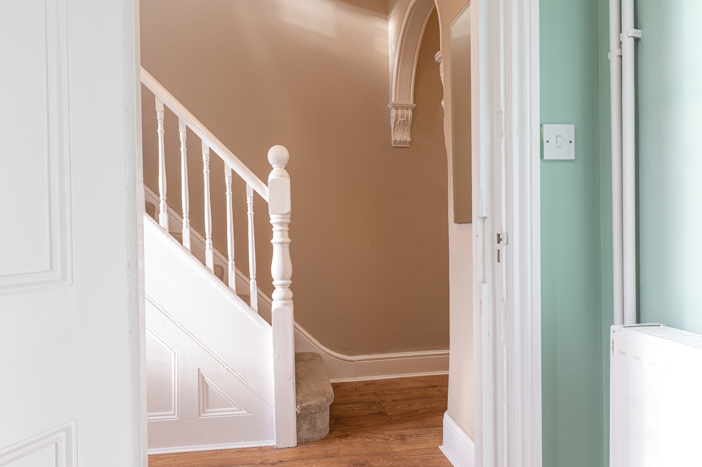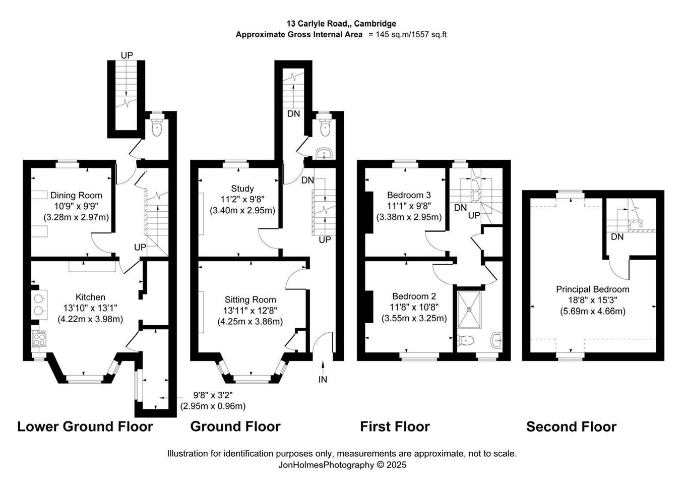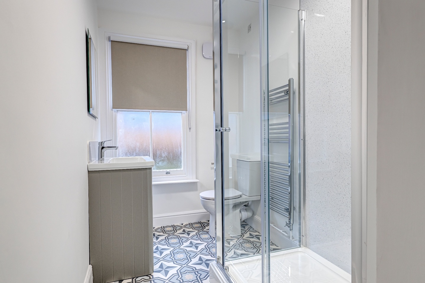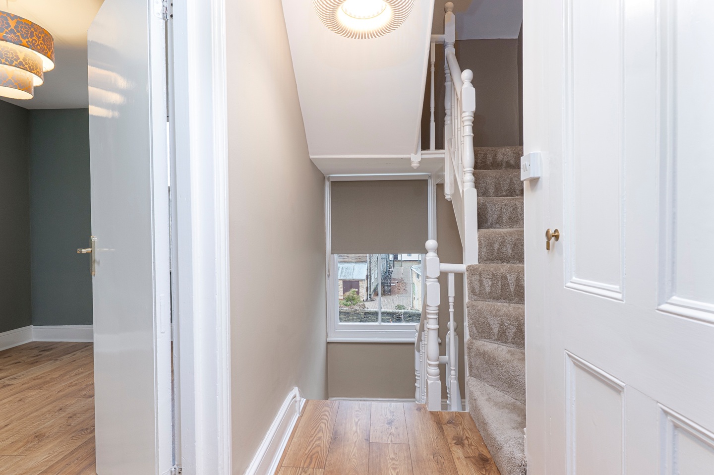 The first floor hosts two comfortable double bedrooms served by a well-appointed family bathroom, complete with a shower, vanity unit and WC. The top floor is dedicated to the principal bedroom, a particularly impressive space with dual-aspect windows providing views over both Carlyle Road and the garden. The room offers space for a dressing area and enjoys an abundance of natural light.