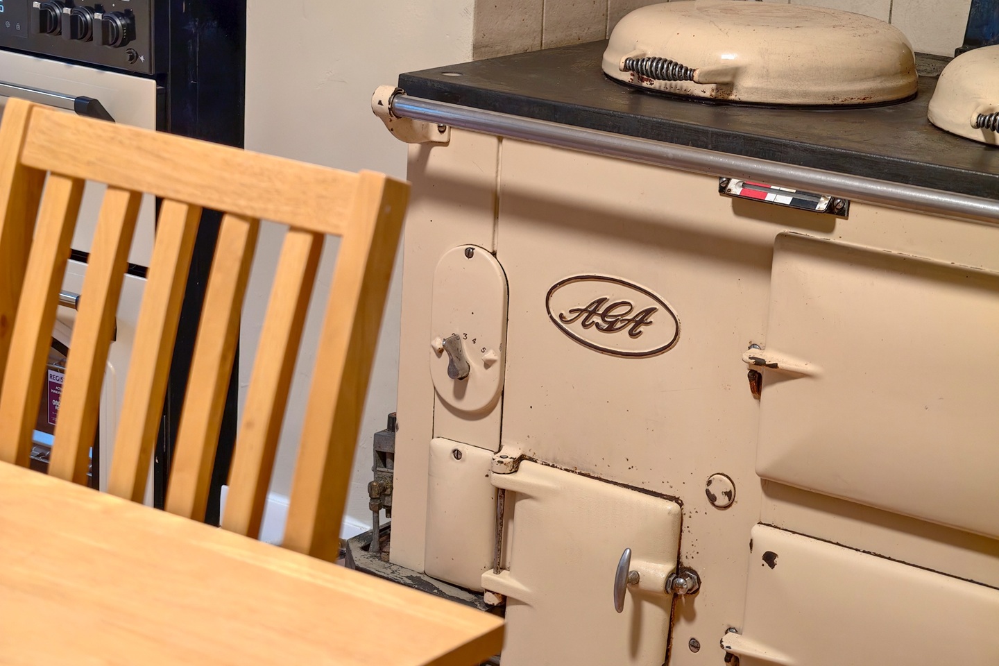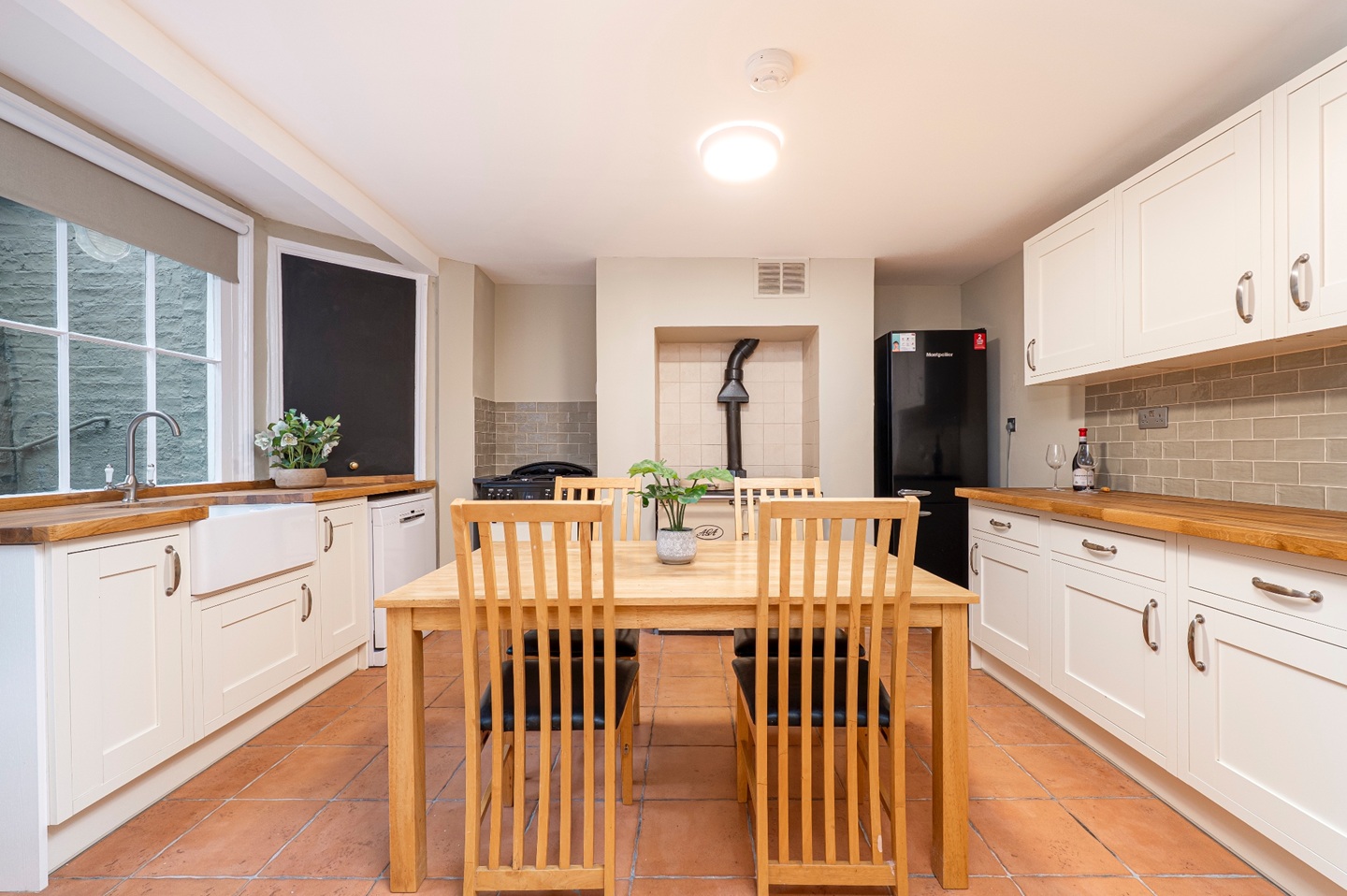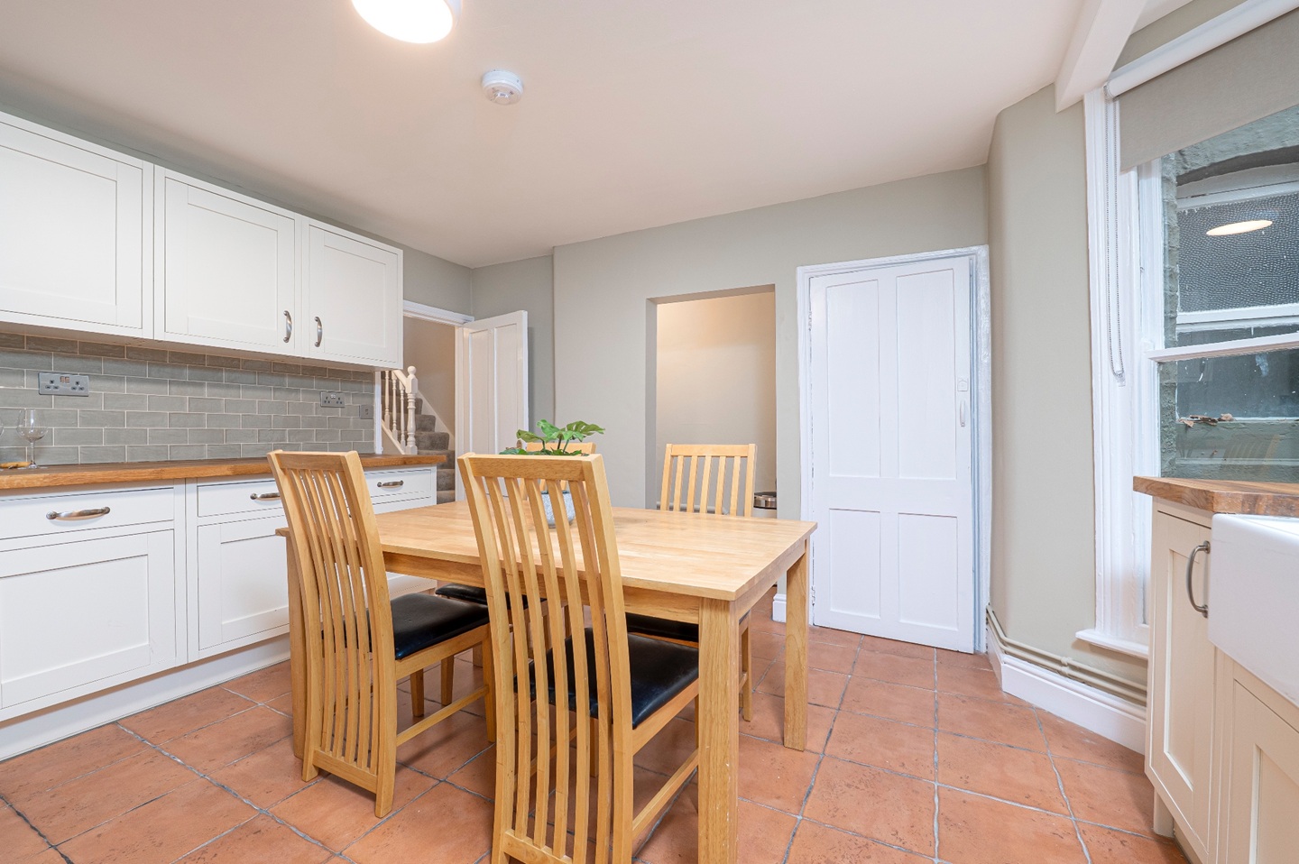 The lower ground floor forms the heart of the home. A spacious, country-style kitchen with wooden countertops, classic cabinetry, and an AGA, creating an inviting space. The kitchen is supported by a separate utility cupboard with a washing machine and dryer and a further pantry, adding to the home’s practicality.