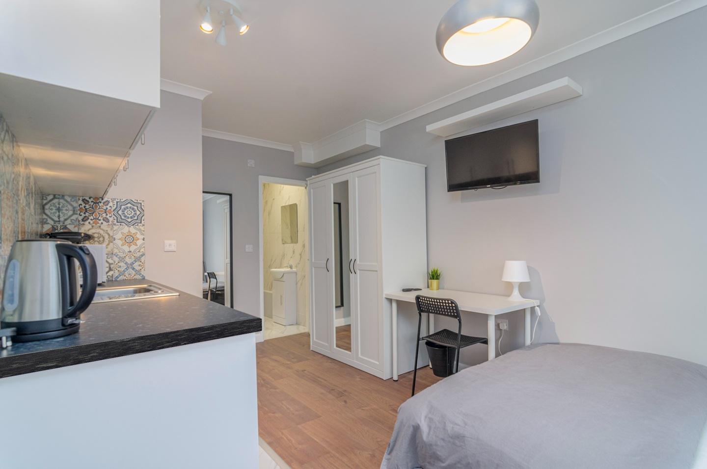 🖥️ There is private mini fridge, washing machine, microwave, kettle and toaster in the unit. There is also a wardrobe, study desk, chair and a TV in the unit.