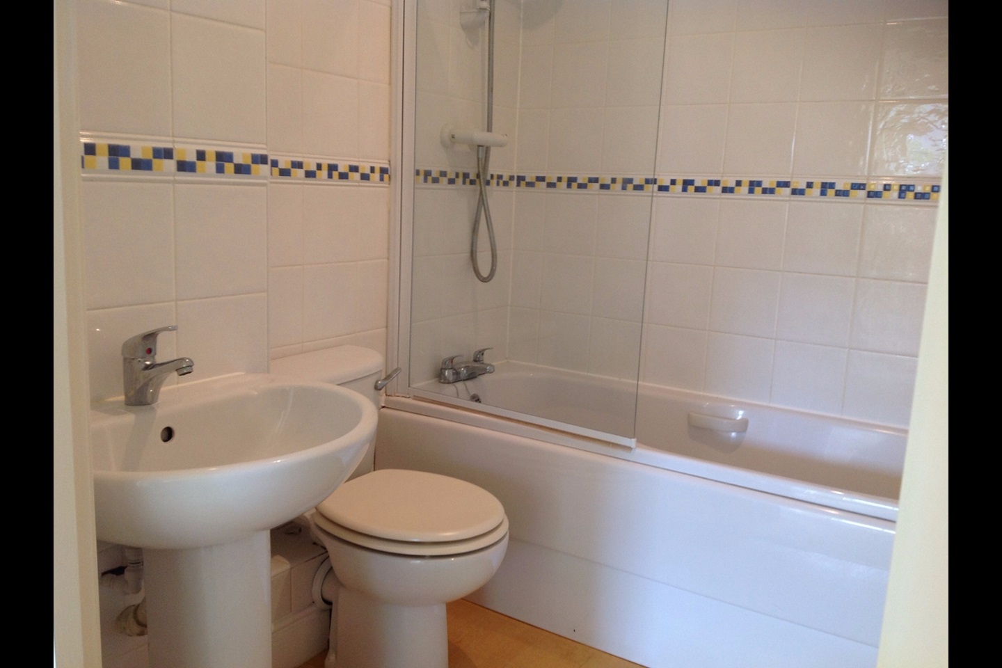 Bathroom: Panel bath, pedestal wash hand basin, low level WC, double radiator, laminate floor.