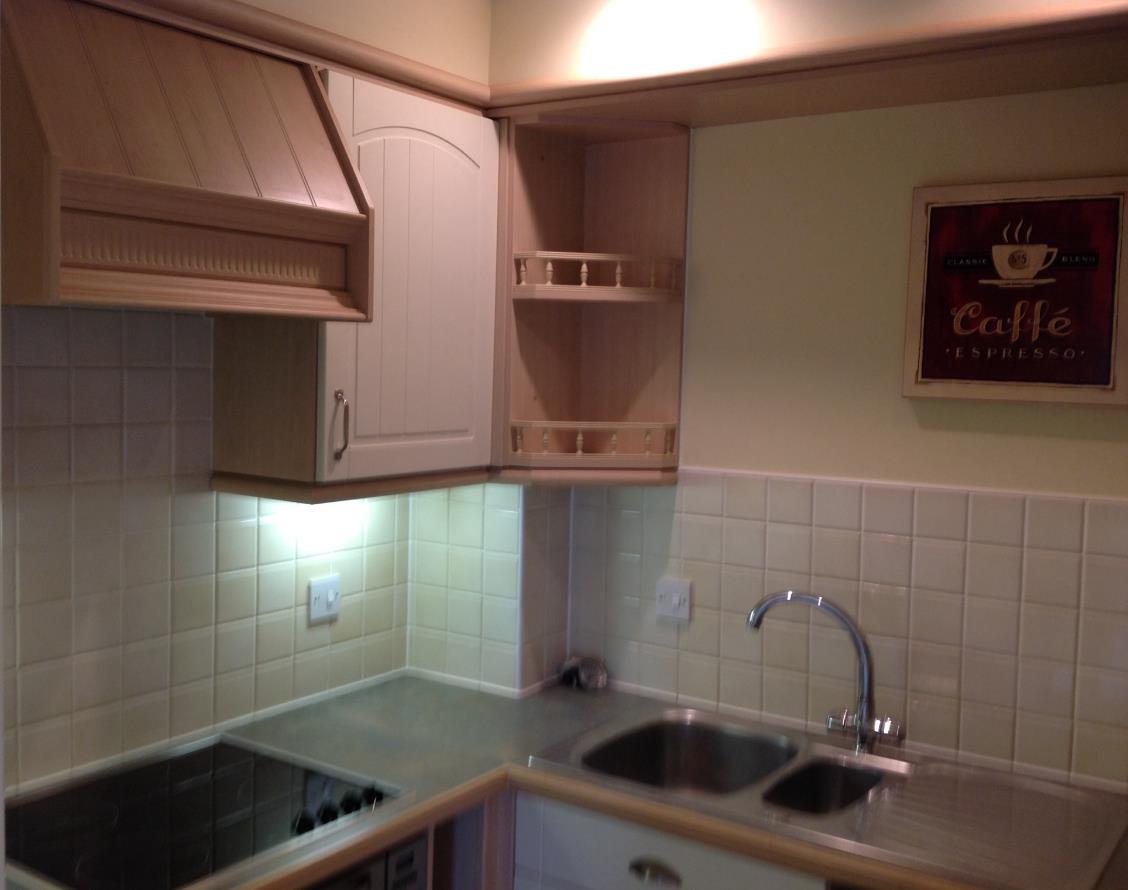 Kitchen: 8'6" x 5' 9" (2.6m x 1.75m). Range of wall and base units with roll edge worktops, integral oven and hob with extractor over, one and half sink drainer unit, tiled floor.