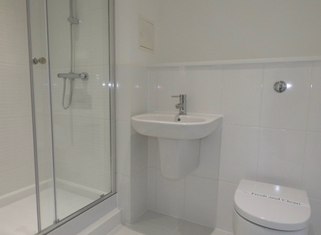 The fully tiled family bathroom with bath, overhead shower, white wall mounted basin and w/c all set in a stylish white and black colour scheme completes this immaculate property.